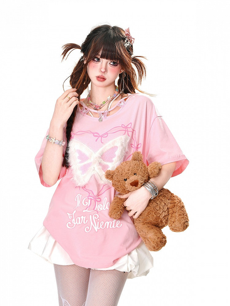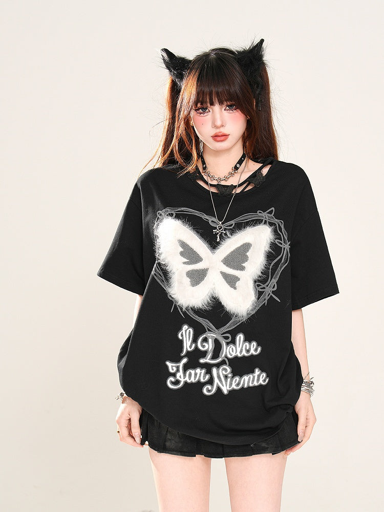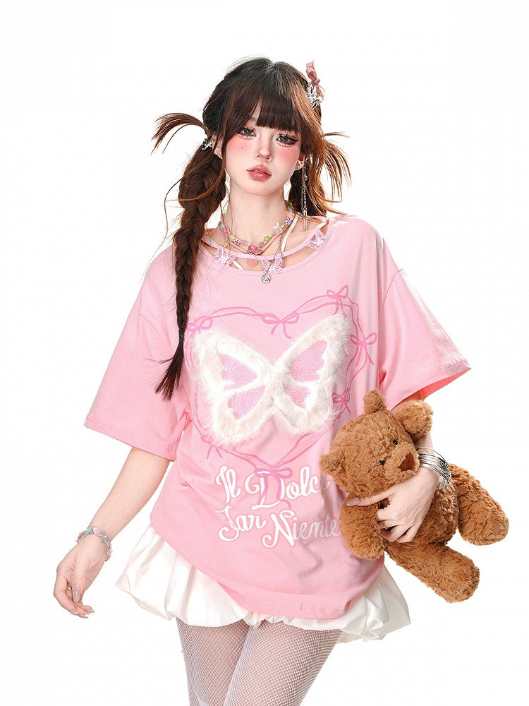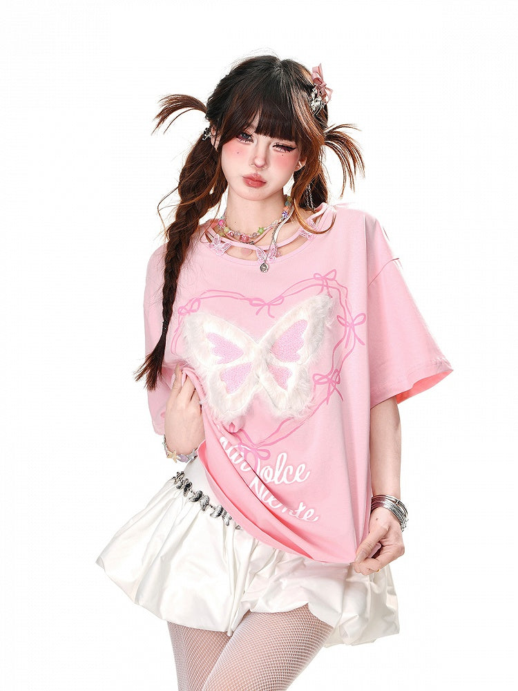 Butterfly Design Neckline Plush Butterfly Pink/Black Graphic T-shirt