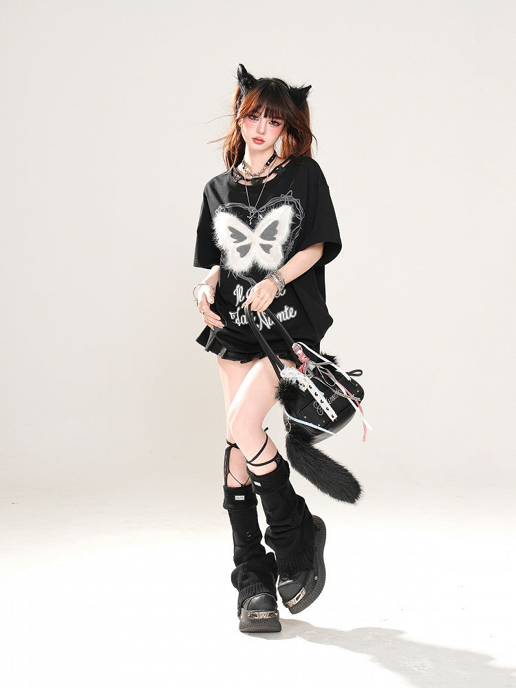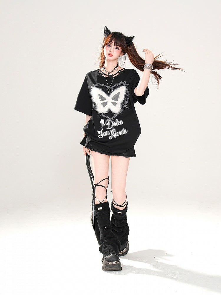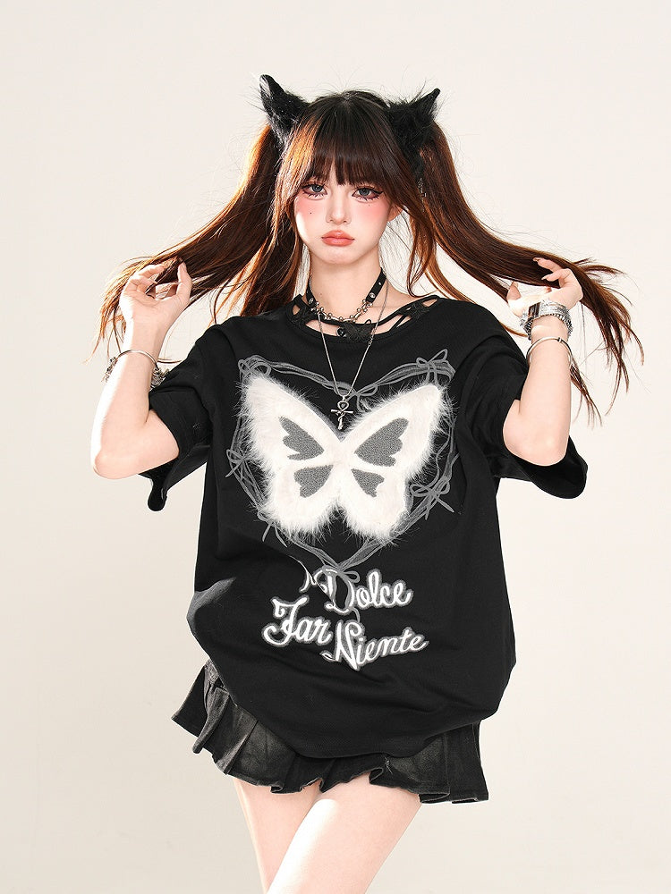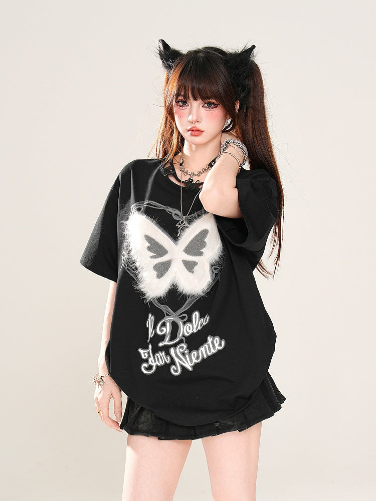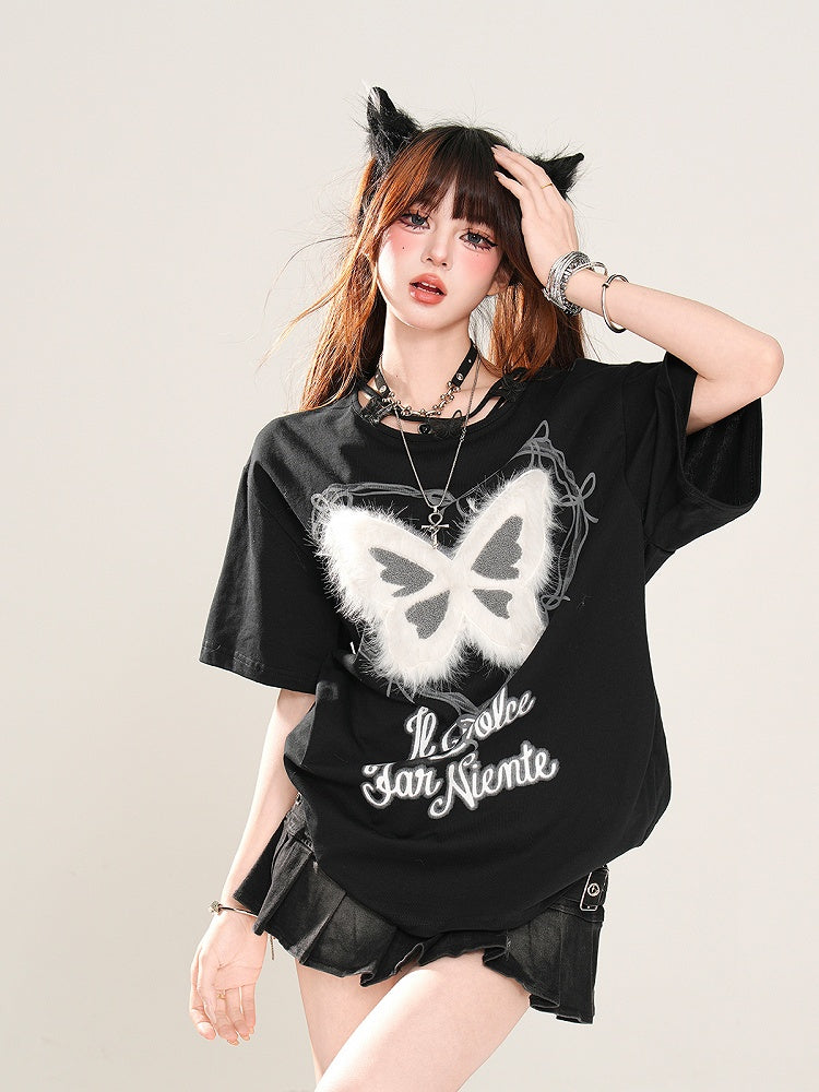 Butterfly Design Neckline Plush Butterfly Pink/Black Graphic T-shirt