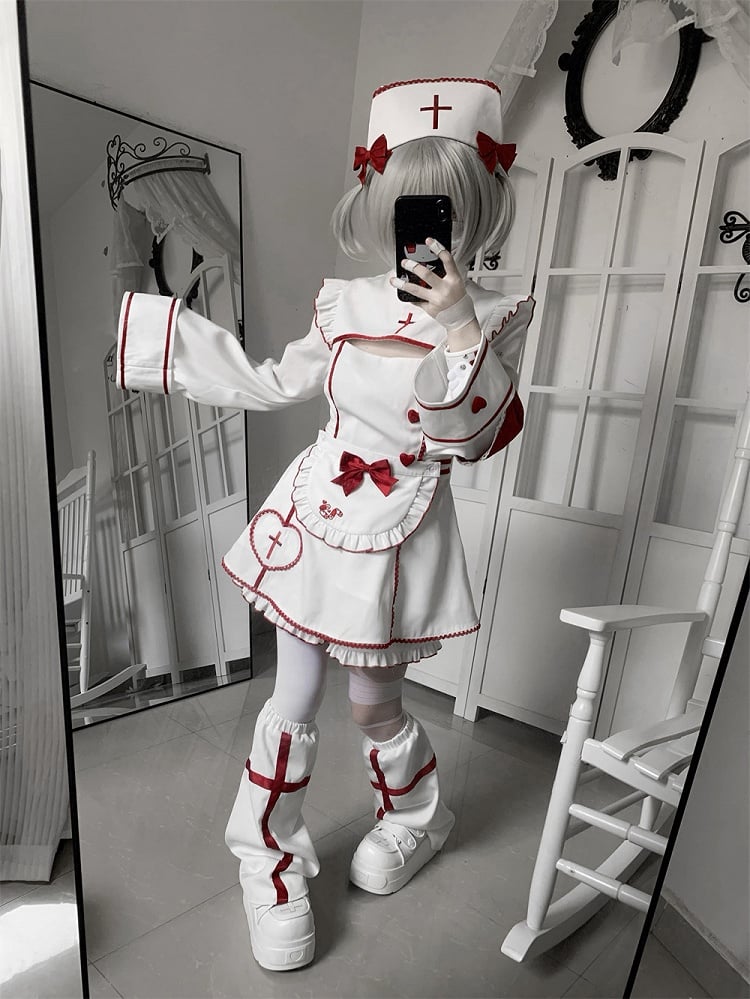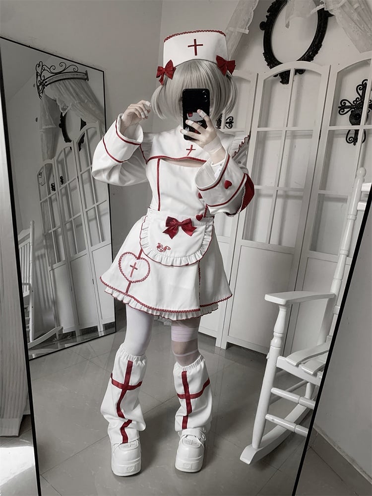 Cap Bow Nurse White Embroidery and Cross Decoration Red for Halloween with