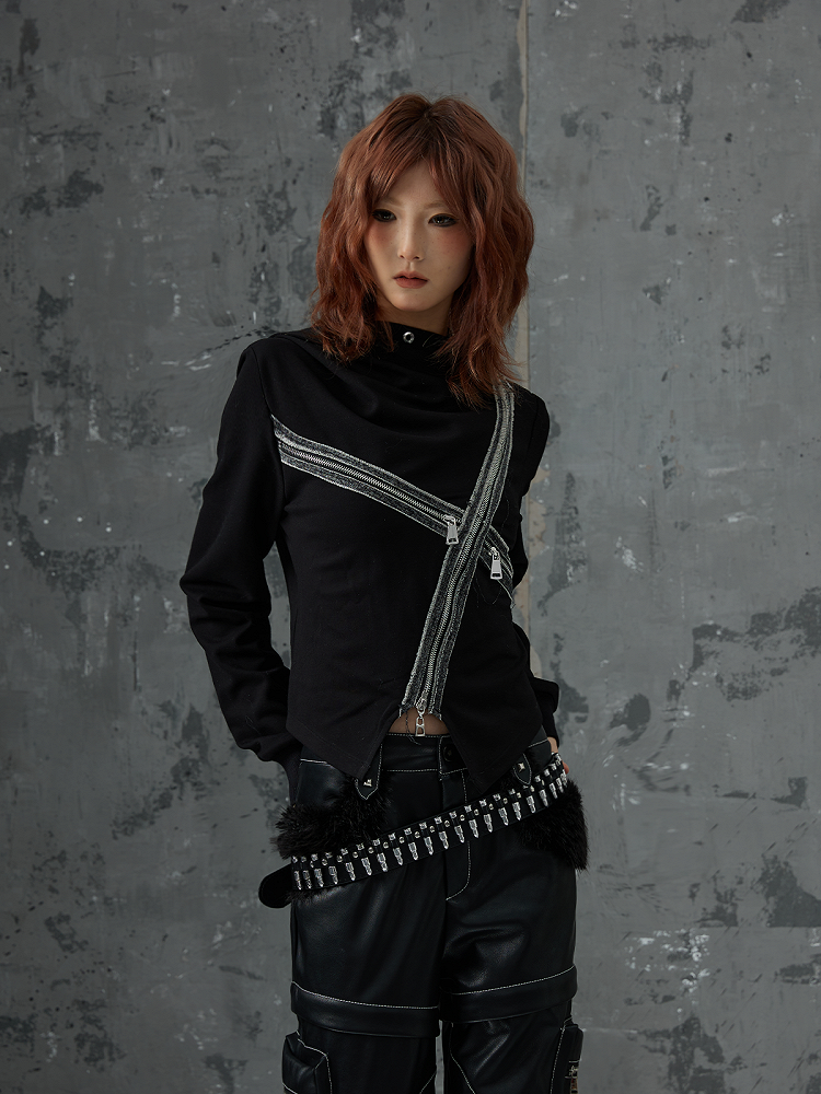 Cardigan With Denim Patchwork Zipper Accents Black Punk Cross Knit Hooded