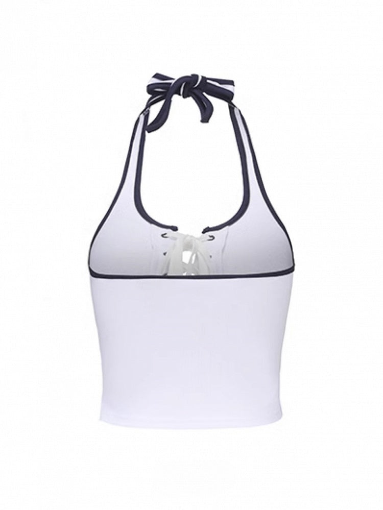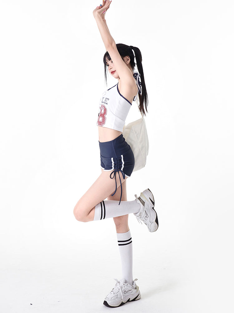 Crisscross Black Lace-ups Letter with Halter Top White Red Crop Print
