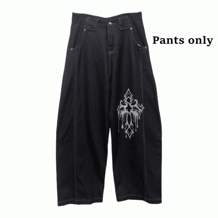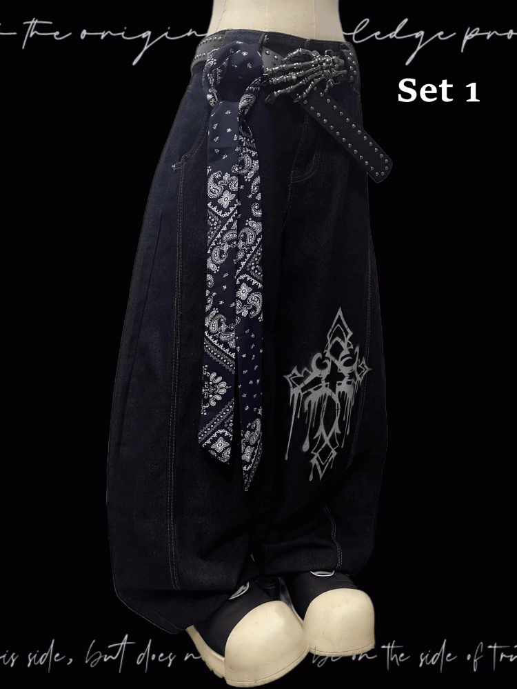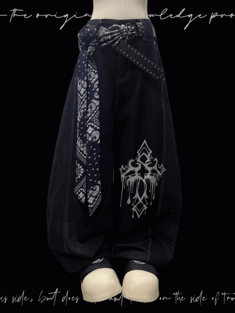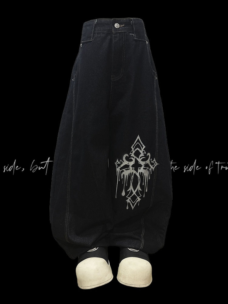Dark Blue Cross Print Loose Wide-leg Jeans