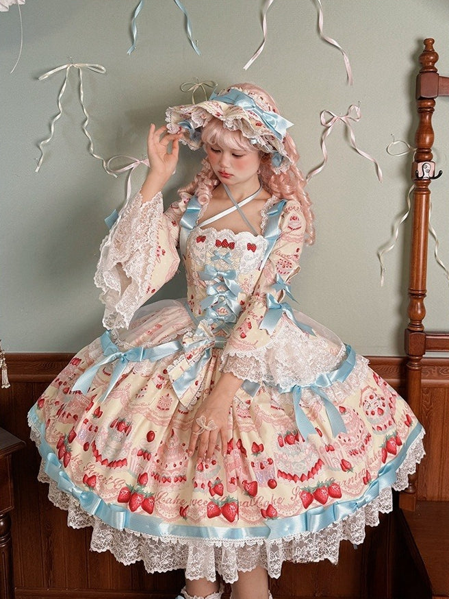 Blue and White Old School Lolita Fashion Dress Bowknot Detais JSK Set