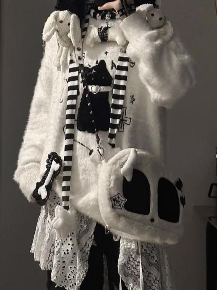 White/Black Kawaii Knit Sweater - Flocked Cat Embroidery & Collar Belt Detail