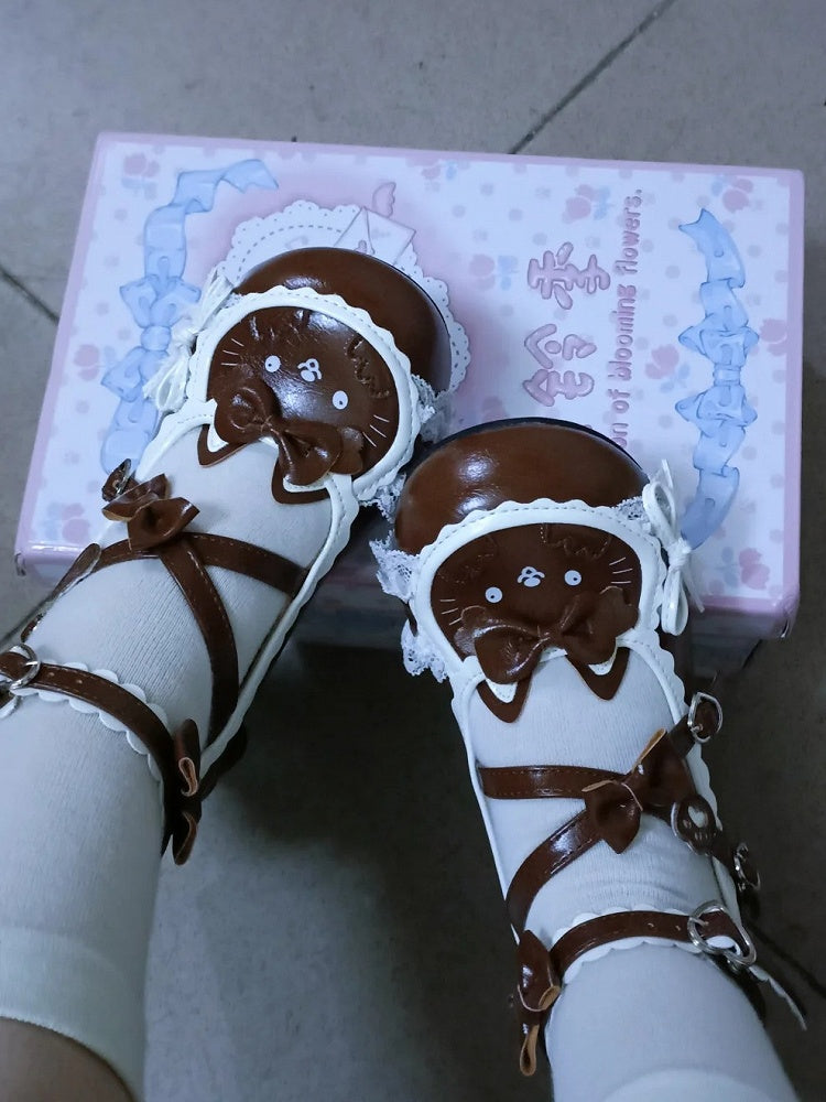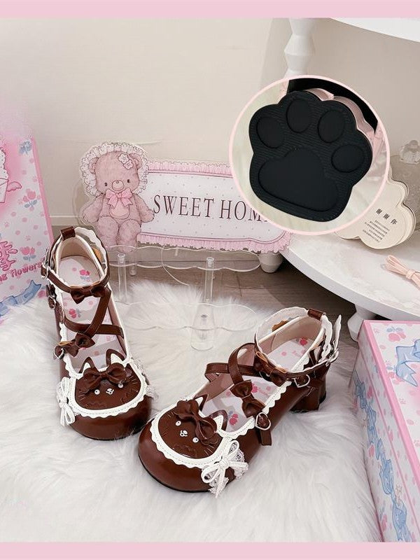 Kitten Details, Bow Details & Heart Buckle Brown PU Mid-heel Mary Janes in Sweet Lolita