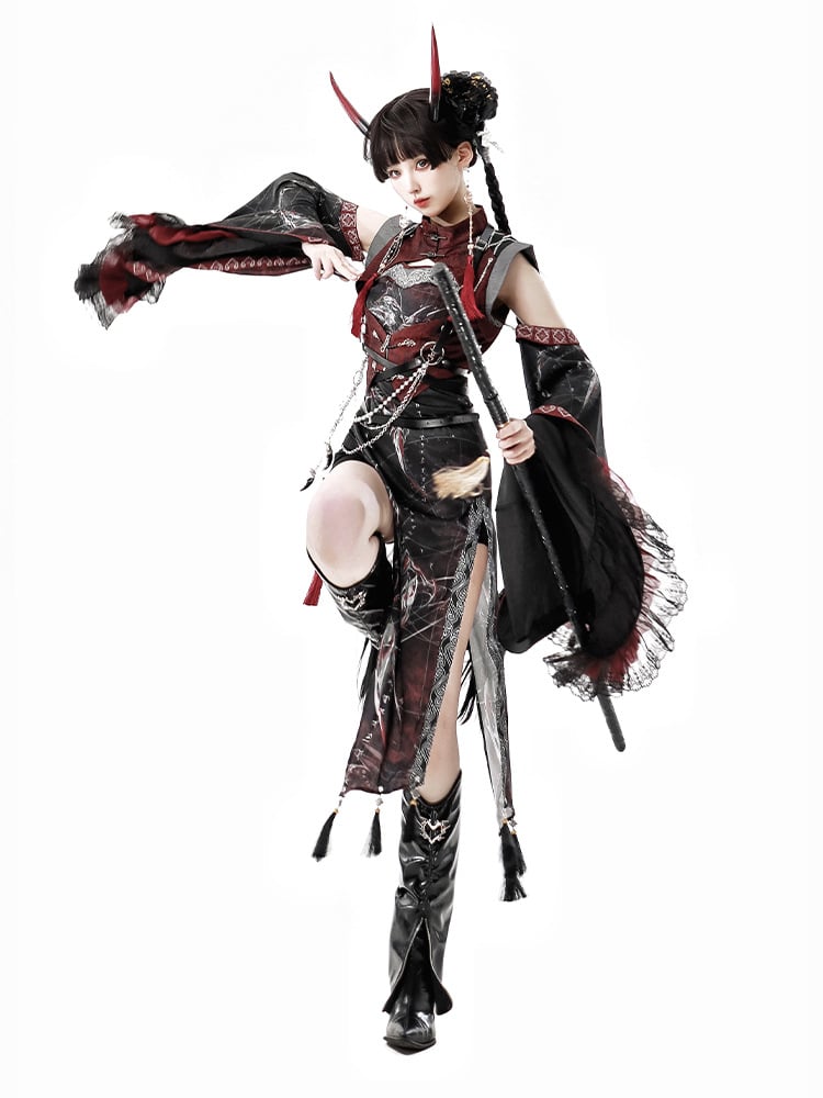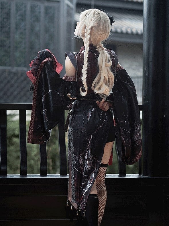 Black & Red Asymmetrical Dress with Chest - cutout Corset Vest