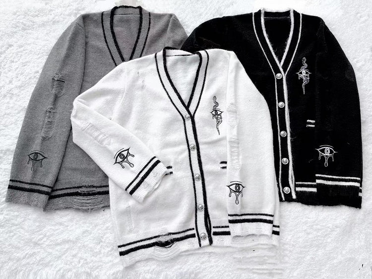 Eye and Snake Embroidery Knit Cardigan Guro Distressed Holes Kawaii Black with