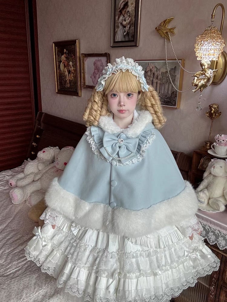 Fur Hooded Baby Cape Winter Blue Trim Woolen Lolita Faux Cat-Ear