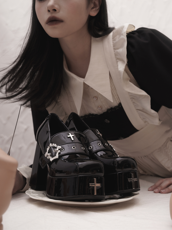 Heel High in Coffin Buckle Gothic with Black Shoes Polished Platform Block 11/13cm