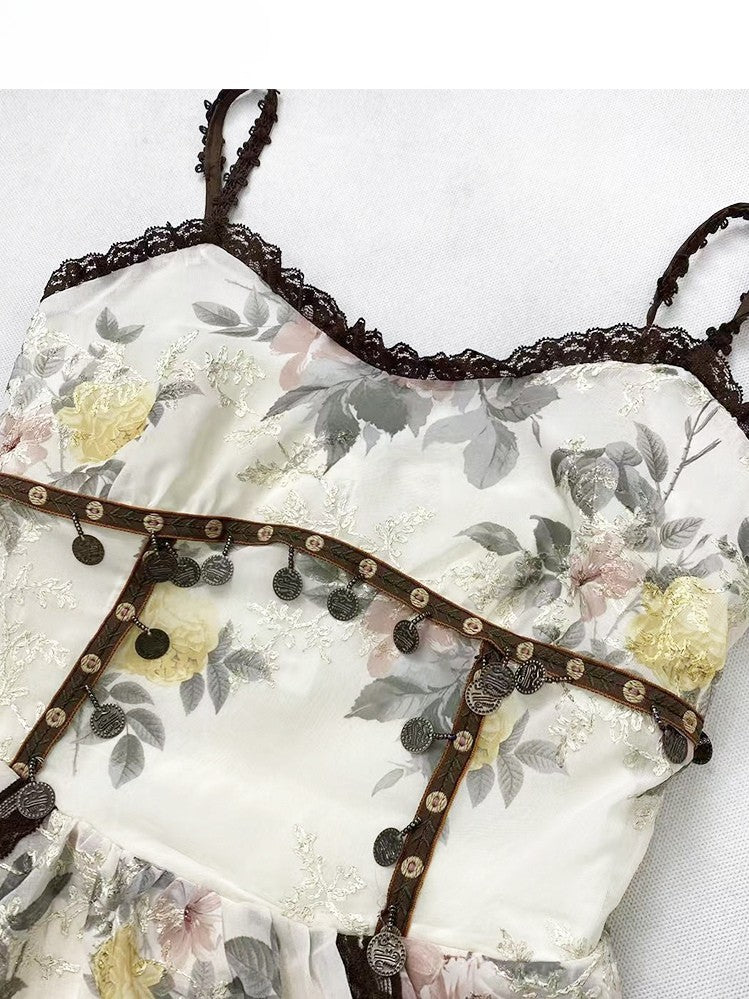 White Floral High-low Skirt Holiday Cami Dress With Brown Bell Sleeves Cardigan