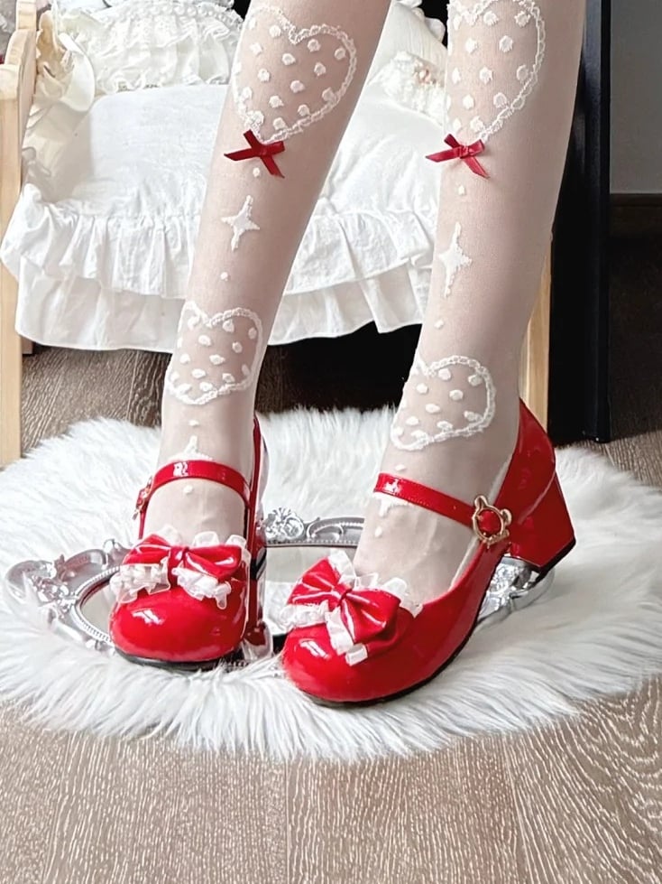 Red Sweet Lolita Mid-heel Shoes in PU with Bow at Top & Lace Details