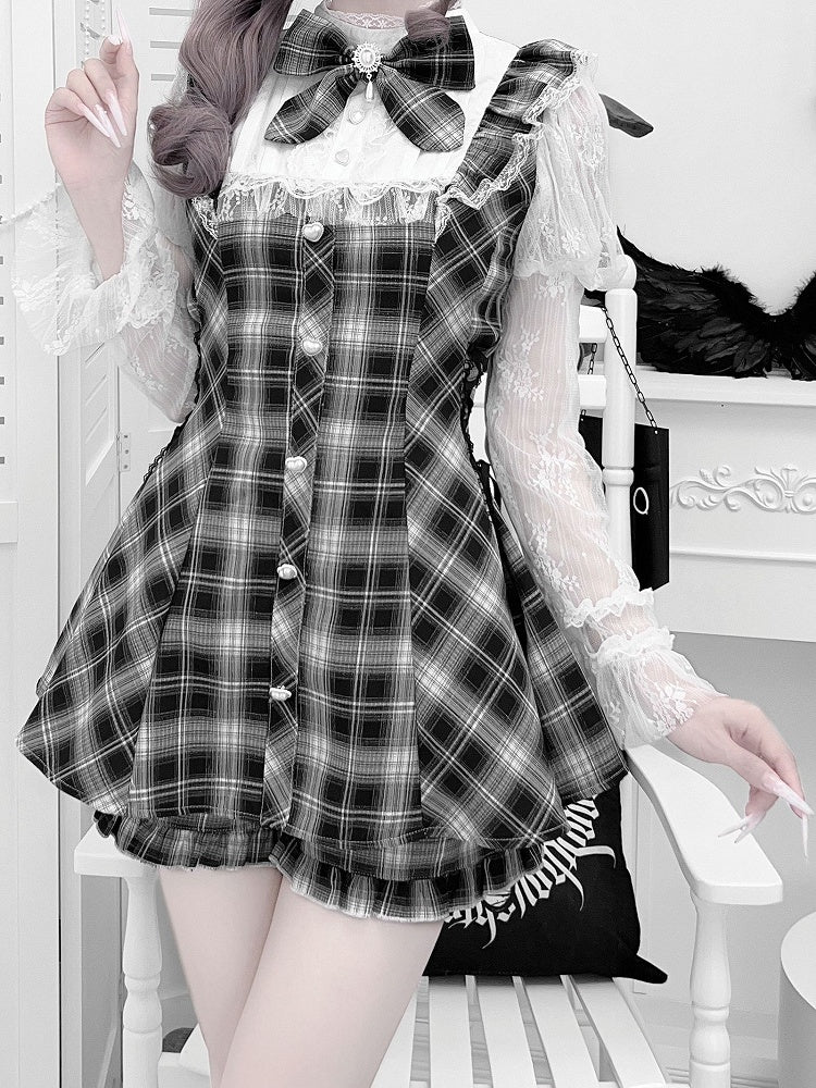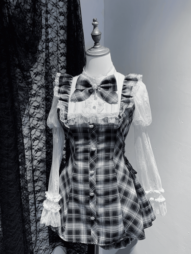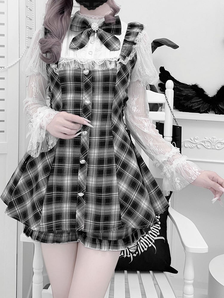Jirai Kei Set: Juliet Sleeve Top and Matching Shorts in Light Blue/Black and White Plaid