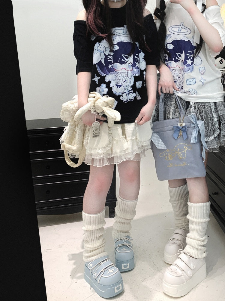 Kei Jirai Yami Kawaii Cartoon Print Zipper Detail Open Shoulder Black/White T-shirt