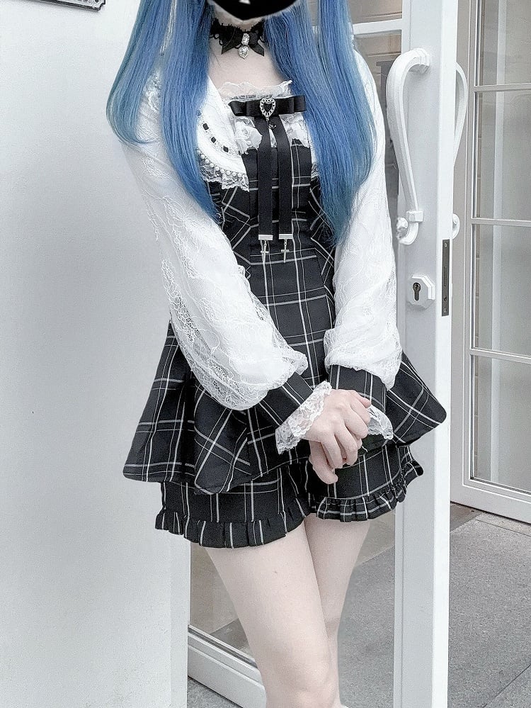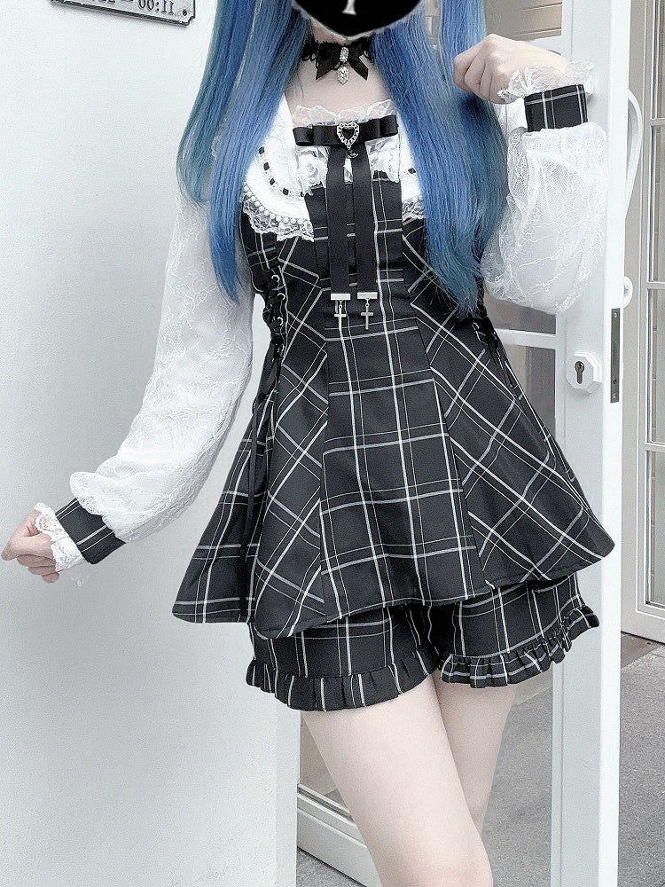 Jirai Kei Black / Plaid Two-Piece Set: Beaded Collar Mini Dress with Side Tie Waist & Matching Shorts