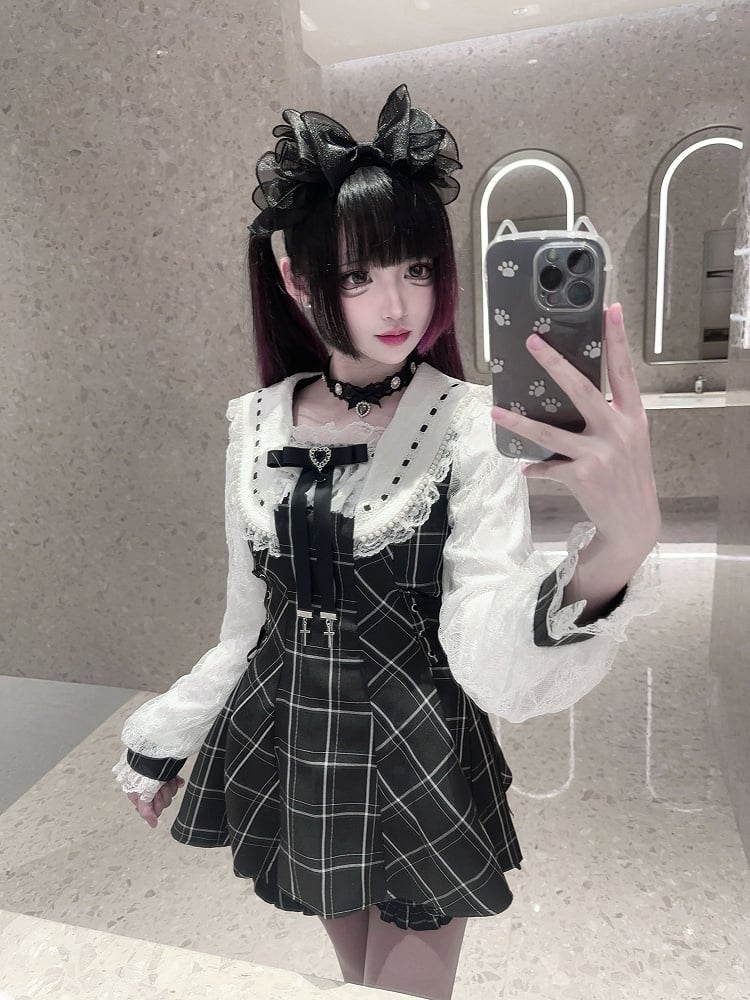 Kei Plaid Set: Matching Black Tie Jirai Shorts with Mini Dress Two-Piece Collar Beaded Waist / Side