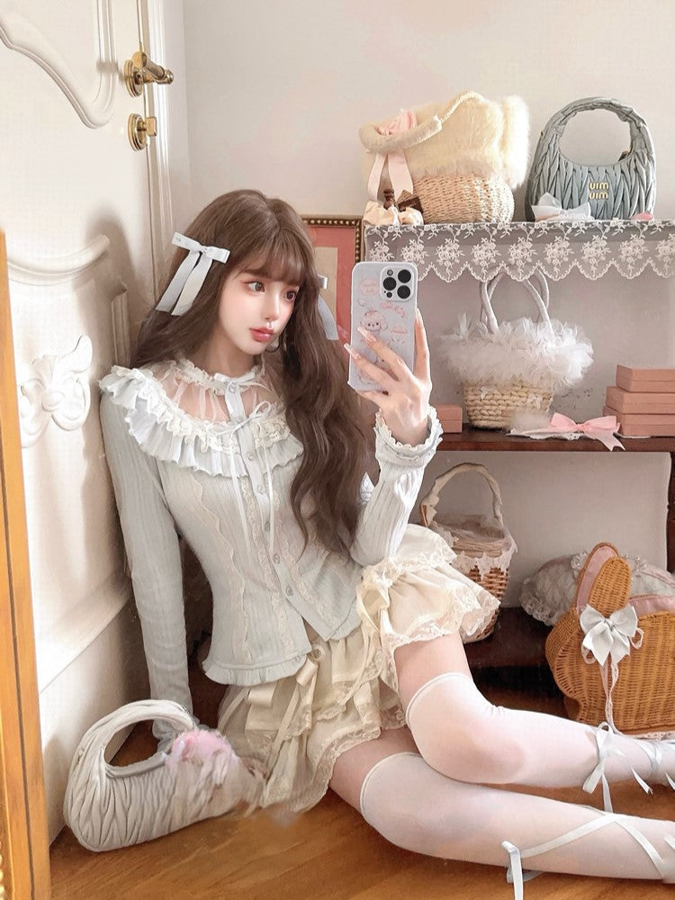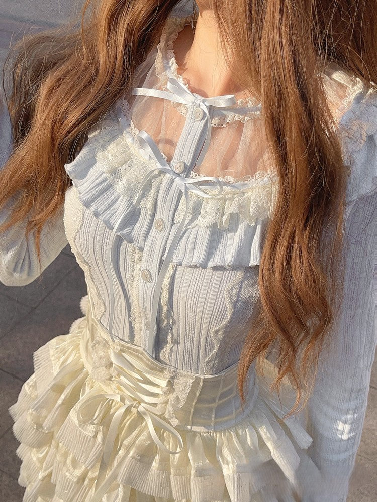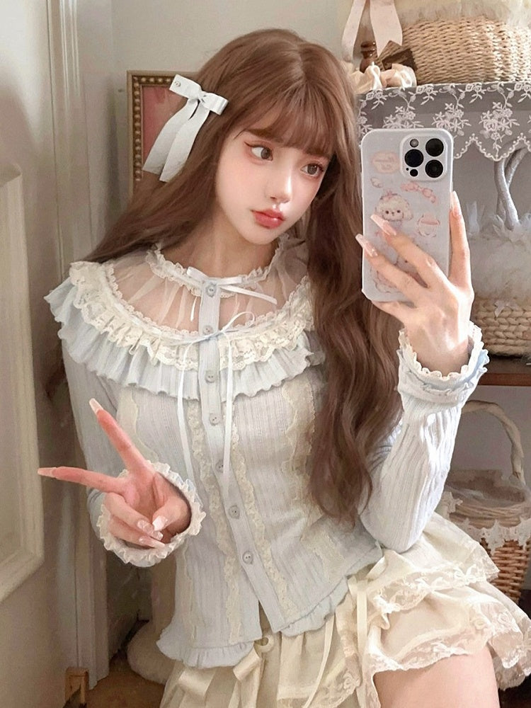 Vintage Blue Bow Ruffled Lace Knit Cardigan