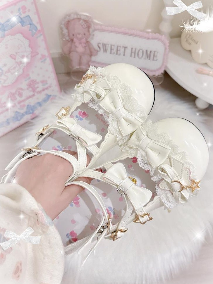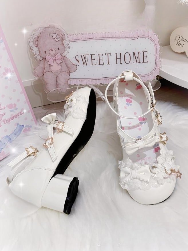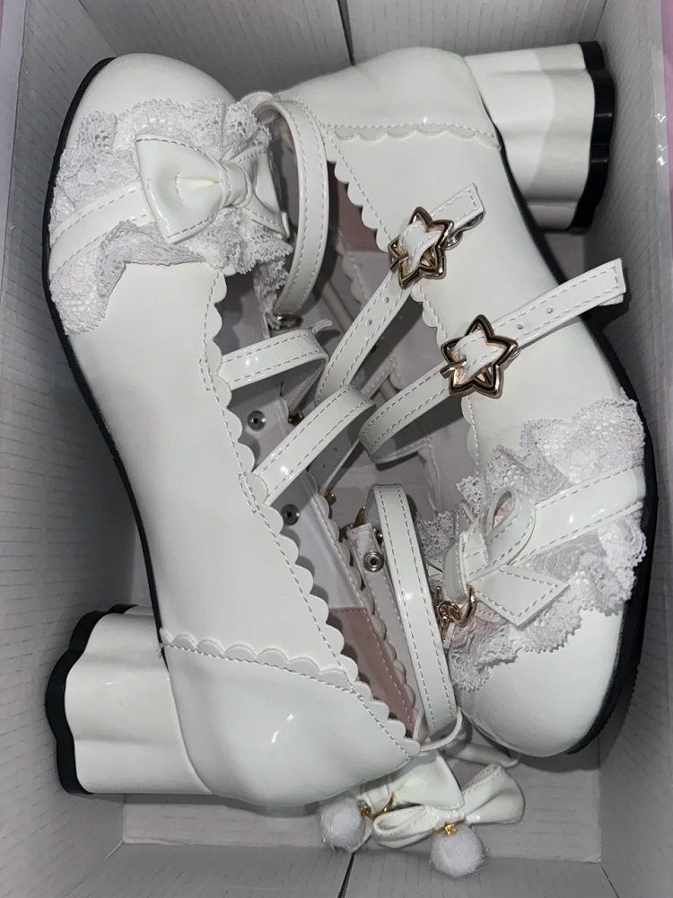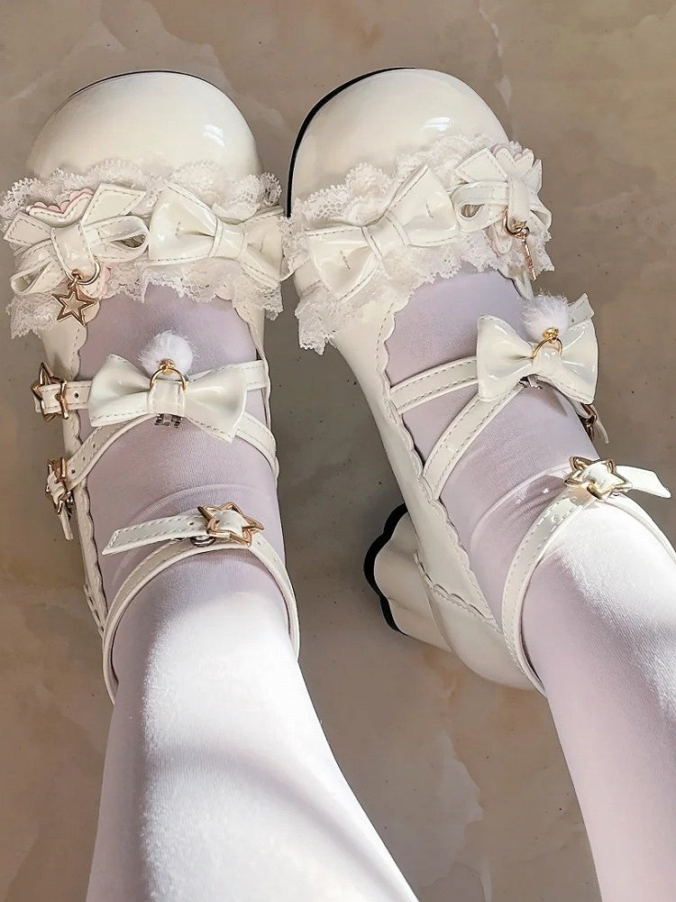 Lace Trim, Bow Accents & Star Details PU White Lolita Mid-heel Mary Janes in Sweet Lolita