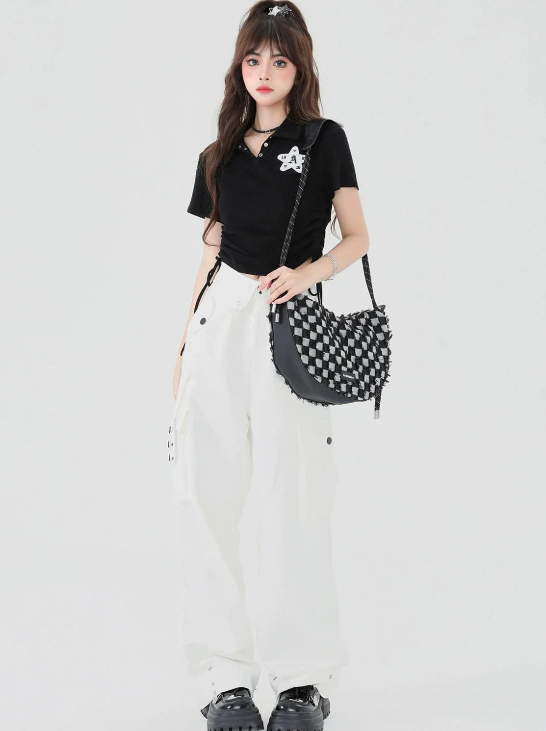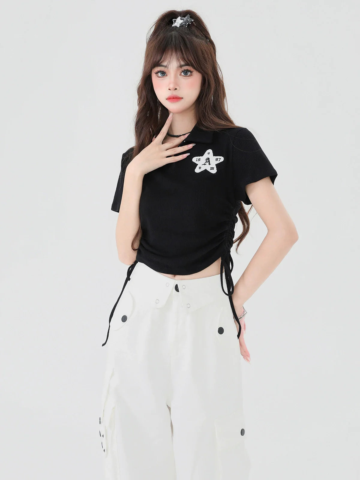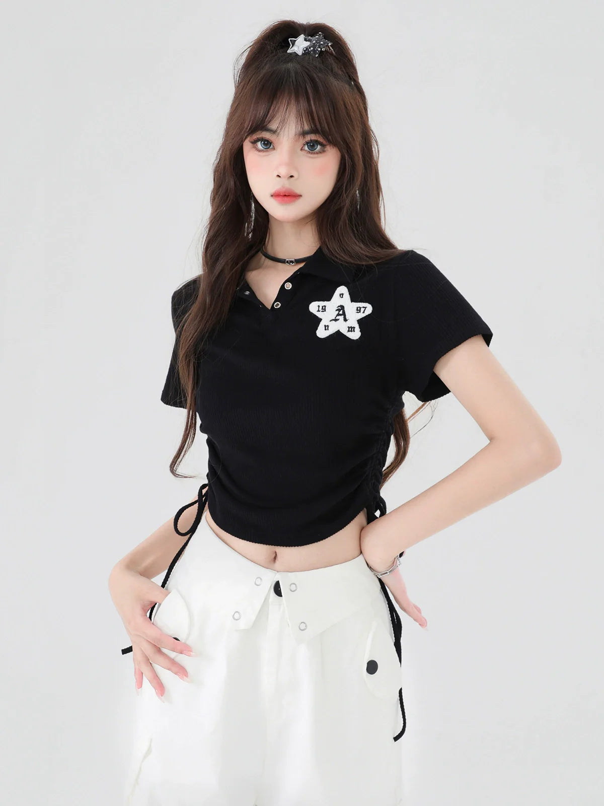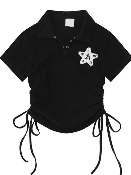 A cute Lace-up Button Top Waist that adds a stylish touch to any outfit. Featuring a unique lace-up design and button details, this top cinches in the waist for a flattering silhouette. A must-have for a charming and fashionable look.