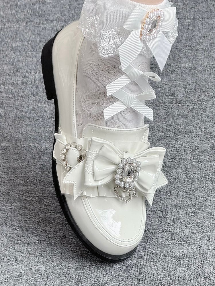 Leather Heels Rhinestone Bead PU Kei with Low Bow Jirai Polished White