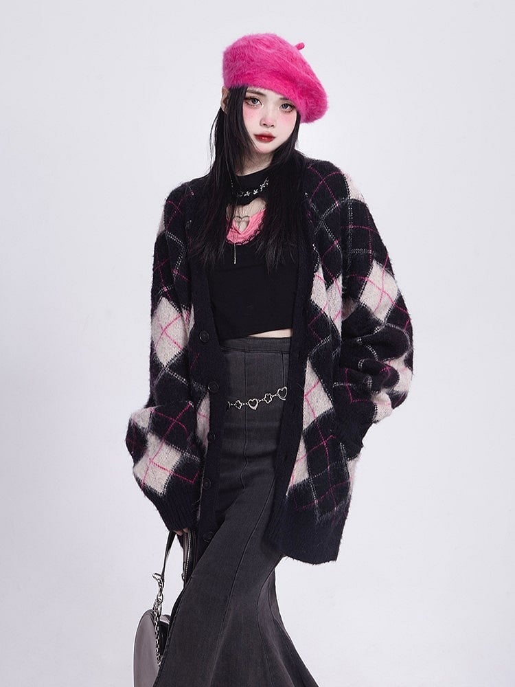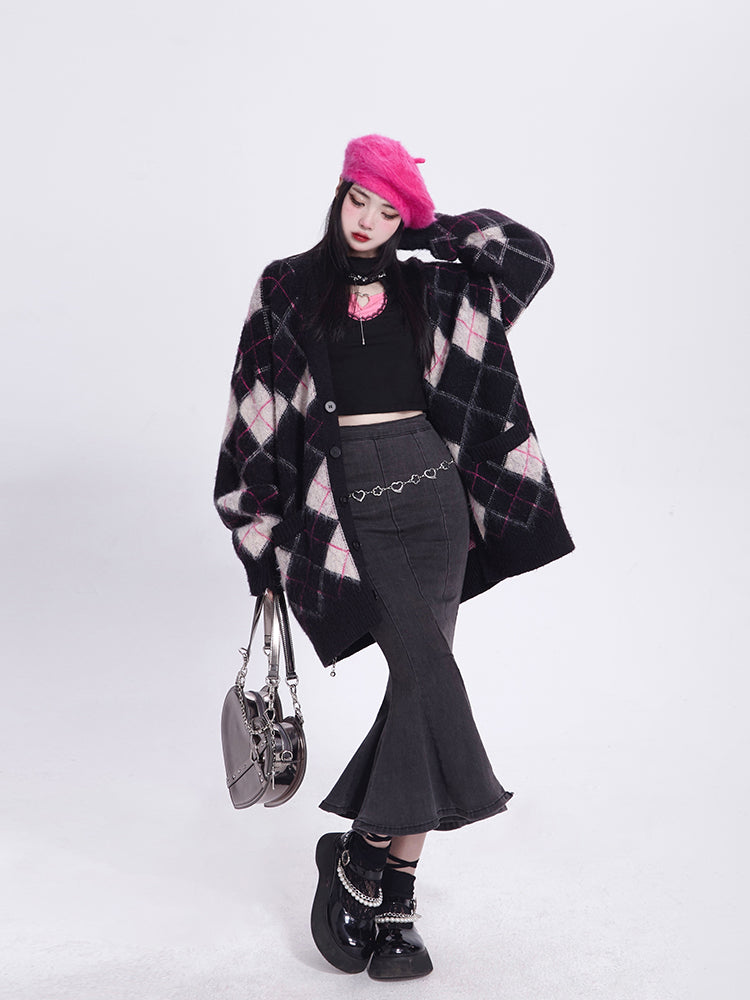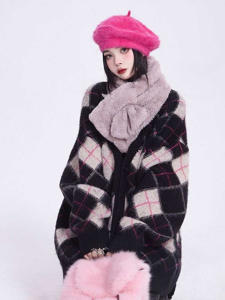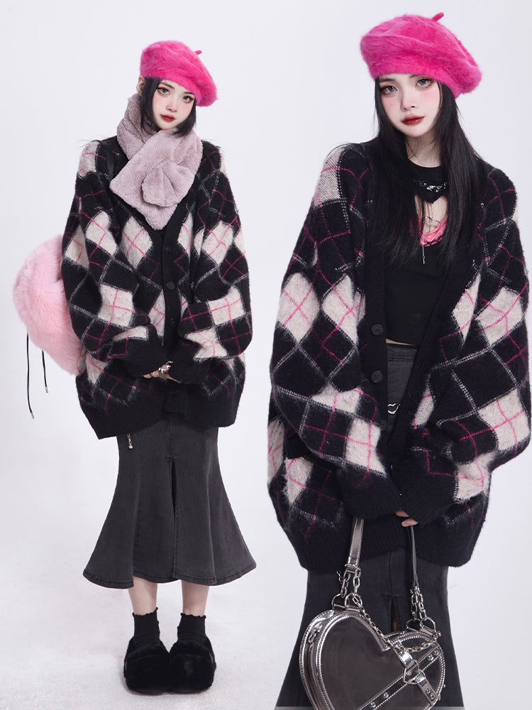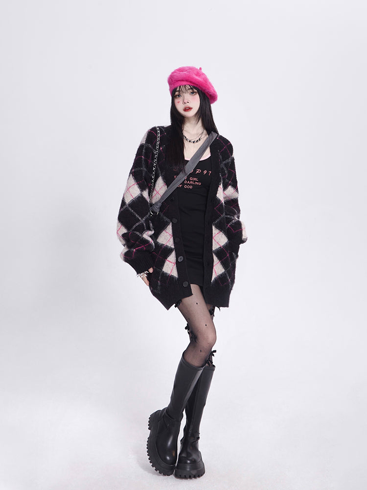 Mink Black Faux Diamond V-Neck Vintage Knit/Brushed Pattern Version Cardigan