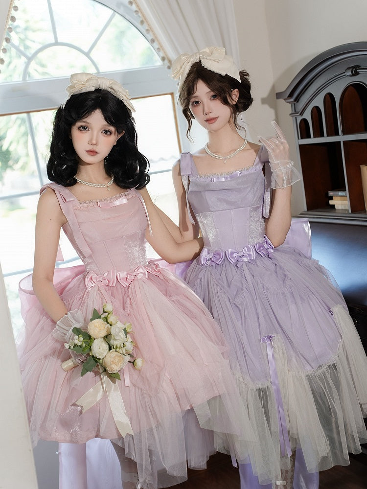 Pink and White Old School Lolita Fashion Dress Bowknot Detais Lolita JSK Set