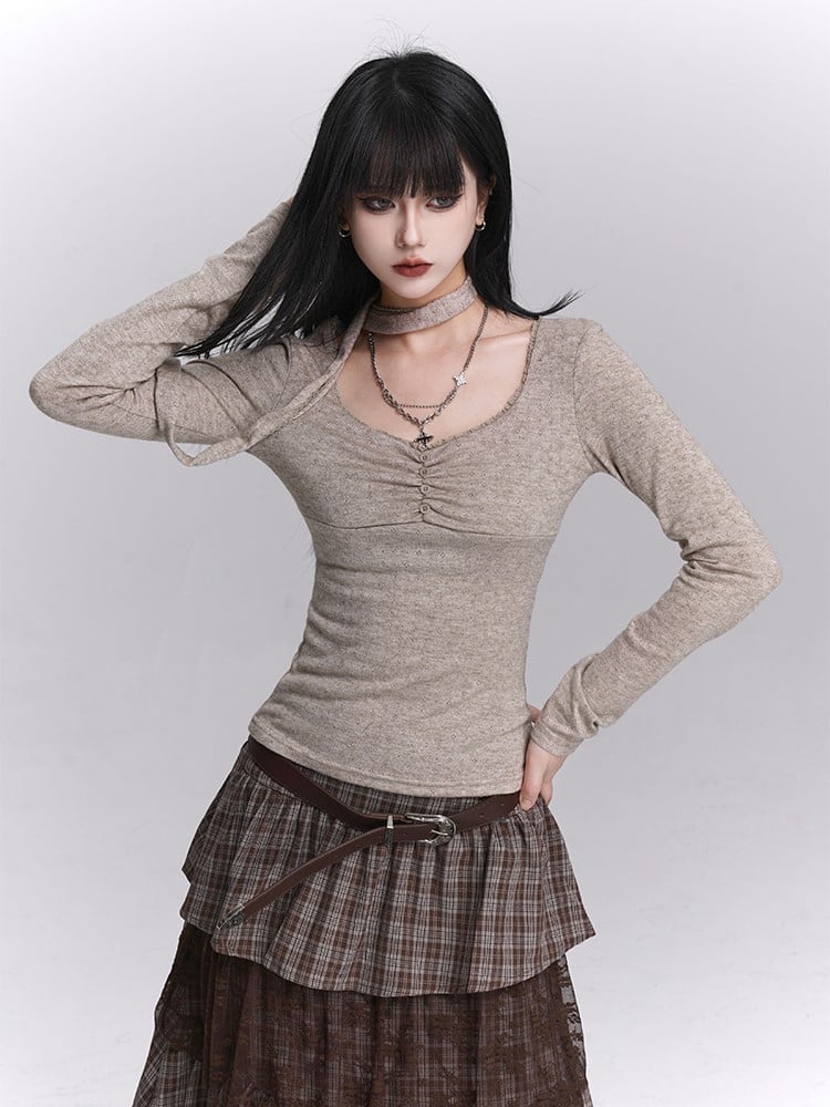 Oatmeal Gray U-Neck Top with Button Ruches & Matching Neck Strap
