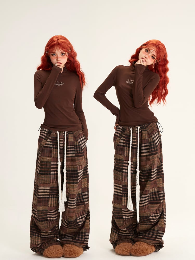 Brown Plaid Patchwork Pants with Drawstring Waist