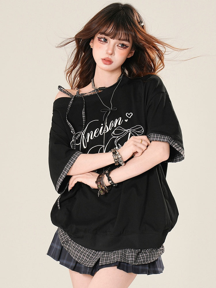 Black Bittersweet Plaid Pattern Self-tie Strap Asymmetrical Neckline T-shirt