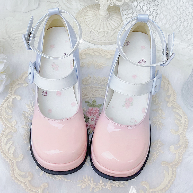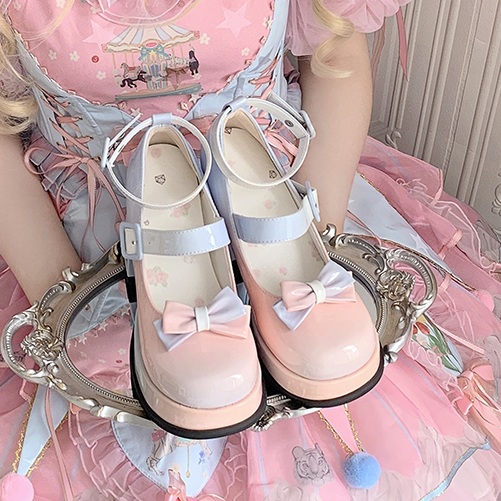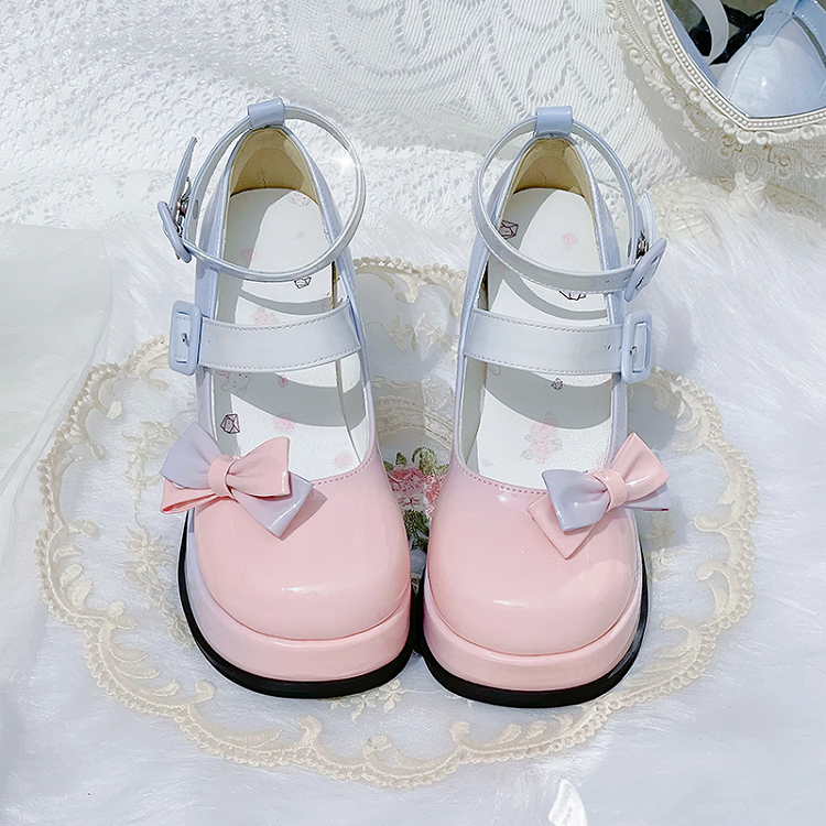 Add a touch of cuteness to your outfit with our Pink-Blue Gradient Detachable Bowknot Platform High Block Heels Lolita Shoes. Their unique design features a detachable bowknot and a gradient of pink and blue, making them perfect for any girly look. The high block heels also provide added height and comfort.
