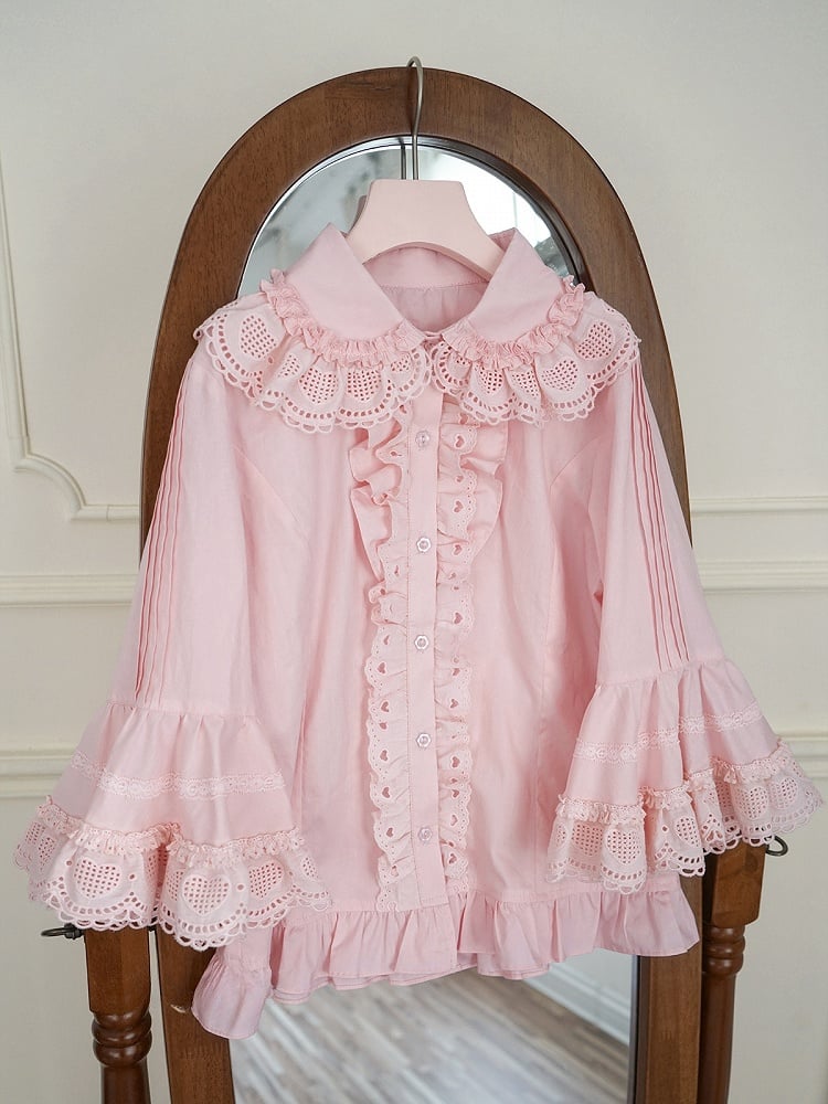 This cute blouse features a pink round flat collar and bell sleeves. Made of soft cotton, it's perfect for a fun and comfortable look.