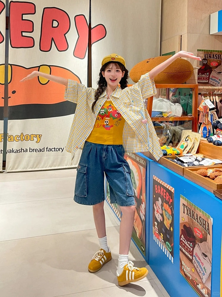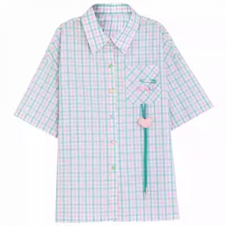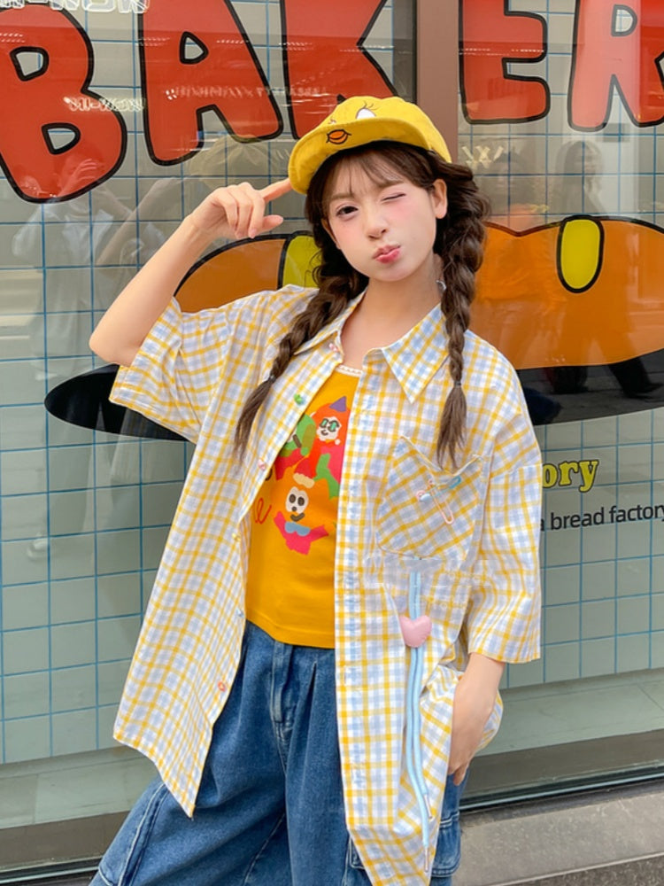 Green/Yellow Star Button Placket Heart Drawstring Short Sleeves Plaid Shirt