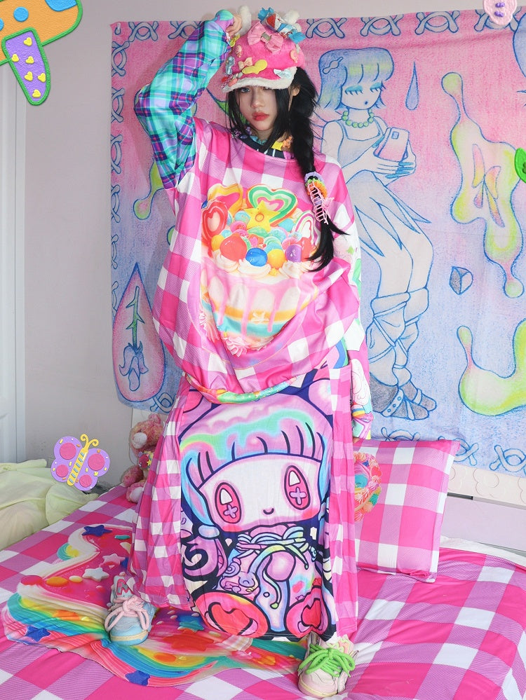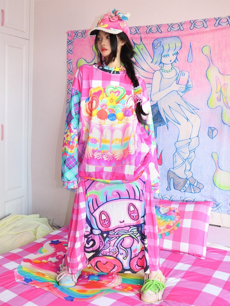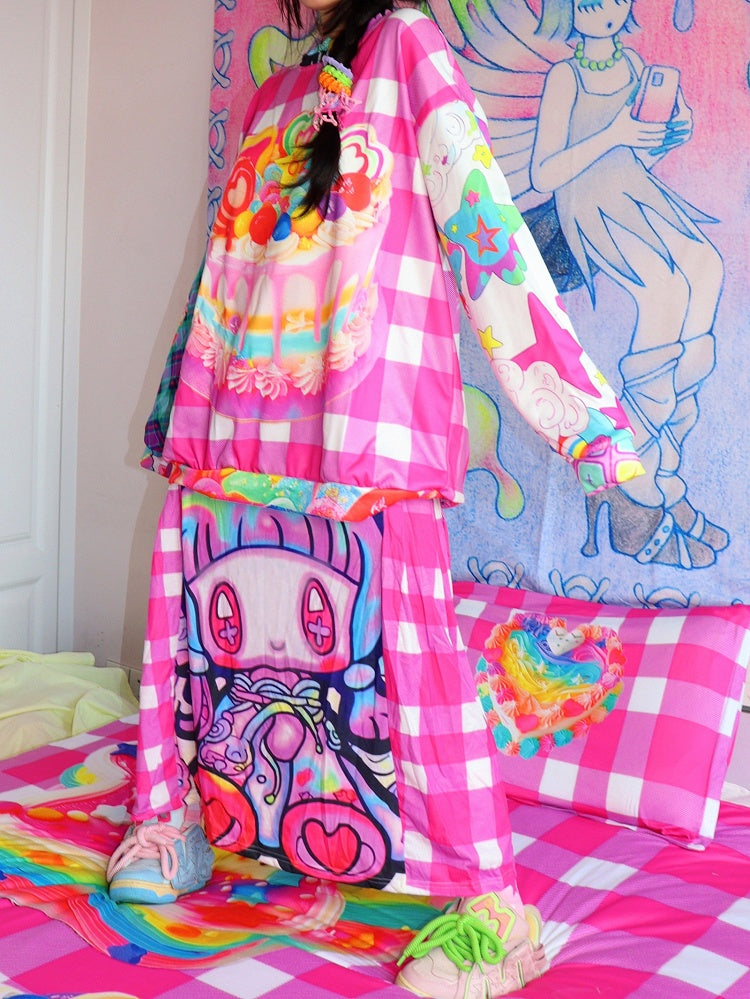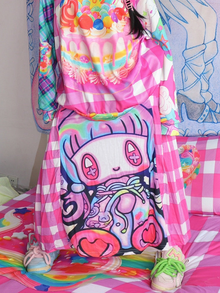 Rose Red Y2K Cartoon Print Plaid Pattern Skirt