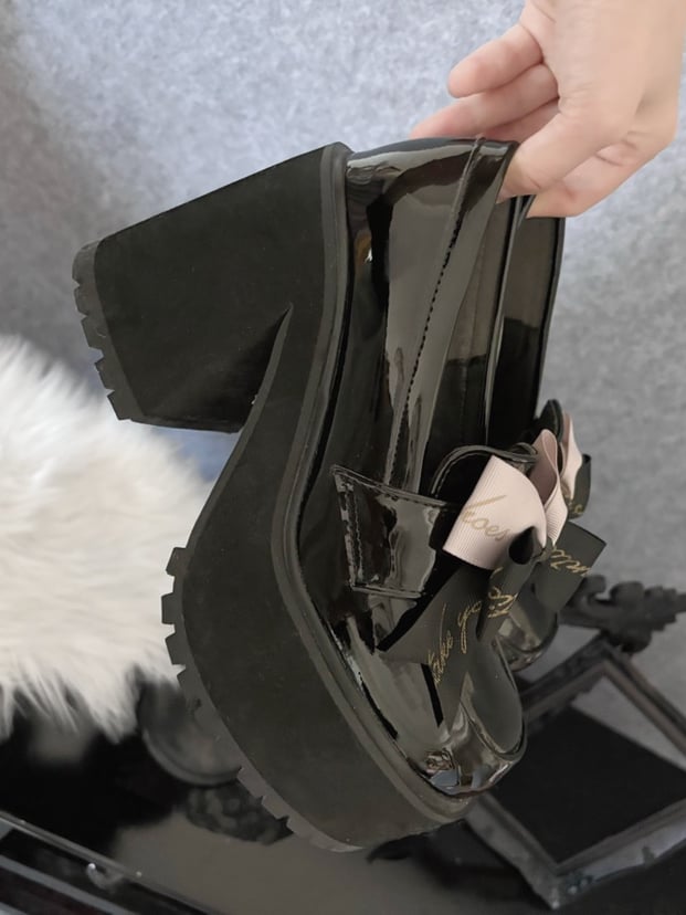 Polished Black Y2K Platform High Block Heel Loafers with Detachable Letter Print Top Bow