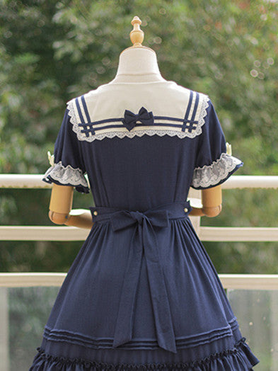 Blue and White Old School Lolita Fashion Dress Bowknot Detais JSK Set