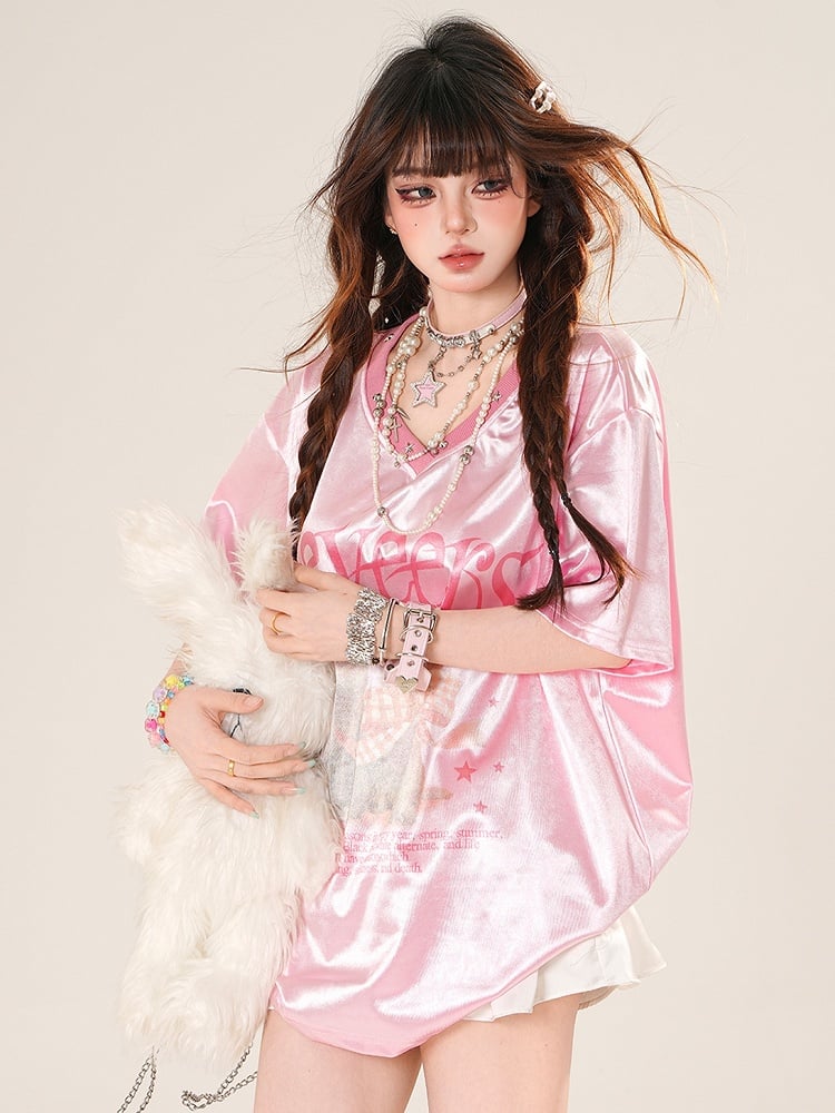 Print And Letter T-shirt V-Neck Cat Puppy Pink/Beige