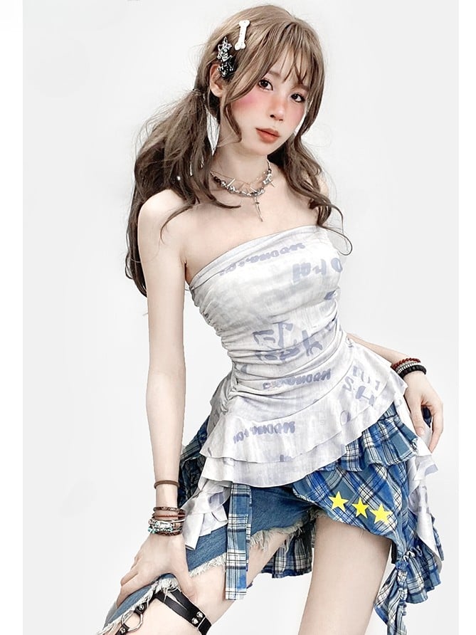 White Bittersweet Glamorous Strapless Top with Letter Print & Asymmetrical Hem