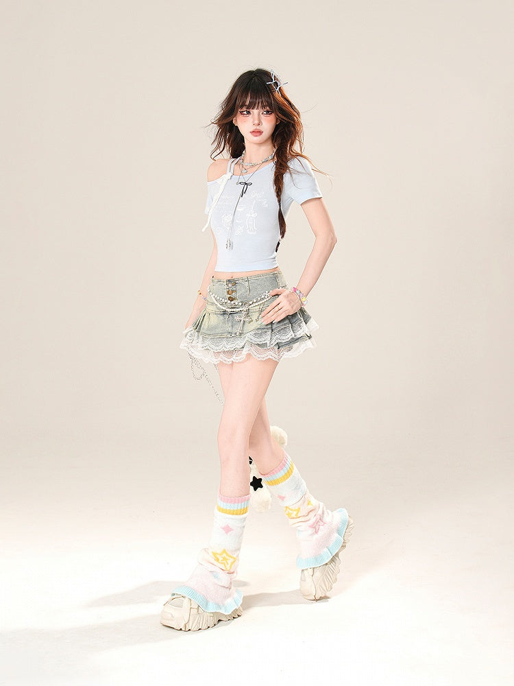 Print Letter Asymmetrical Neckline with Blue T-Shirt