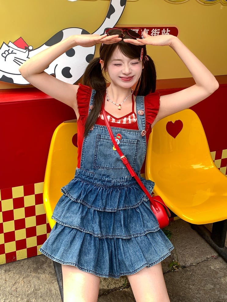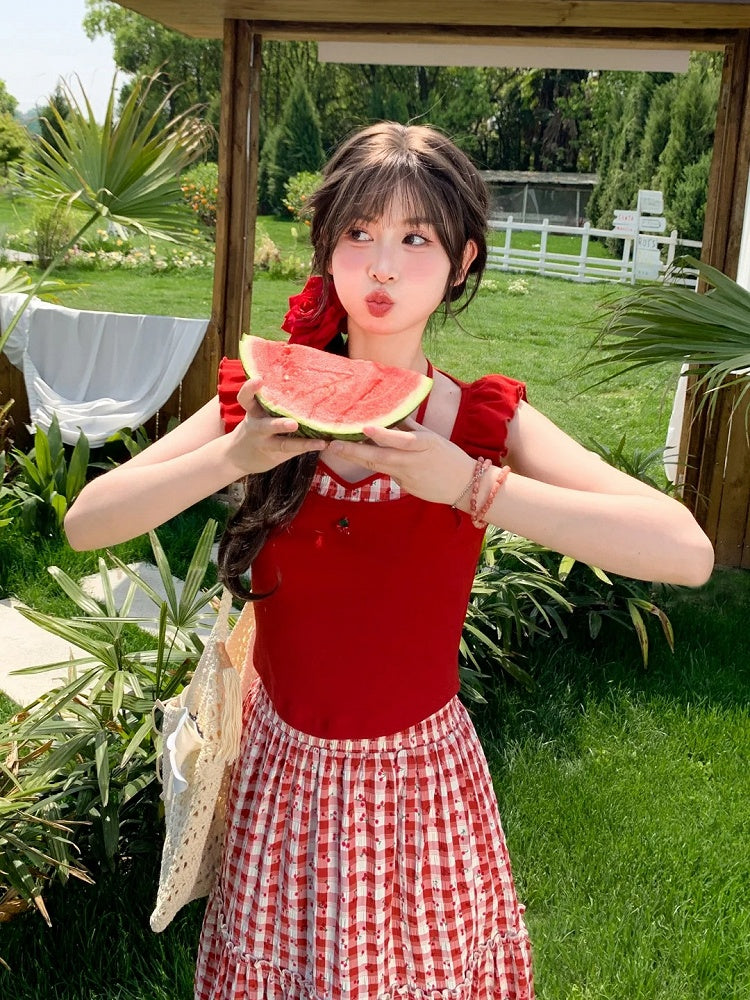 Red Halter Neck Flutter Sleeves Cherry Embroidery Neckline Tank Top Faux Two-pieces
