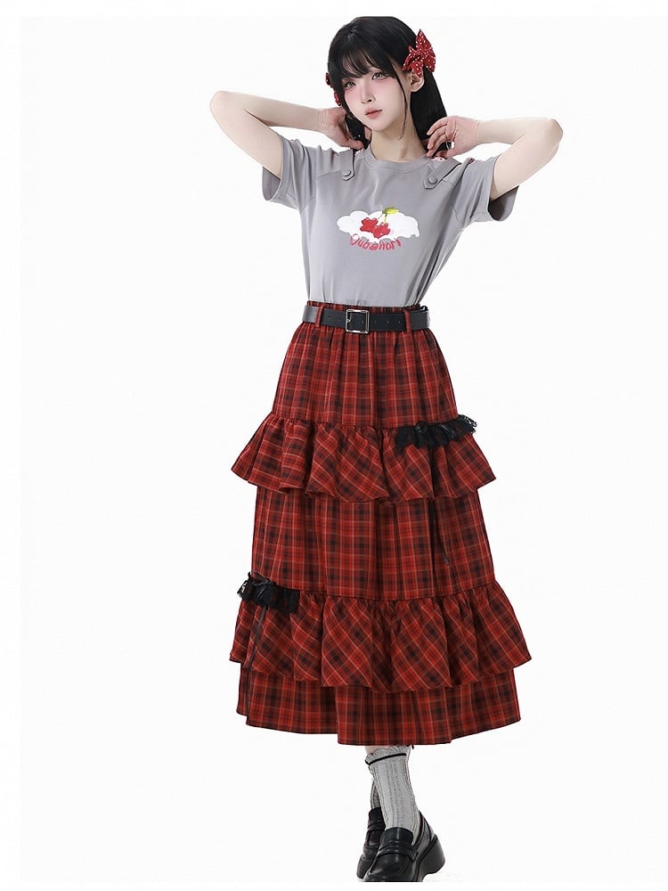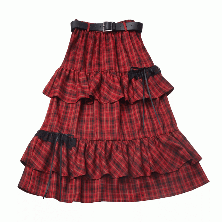 Red Plaid Bowknot Tiered Skirt with Buckle Belt Details