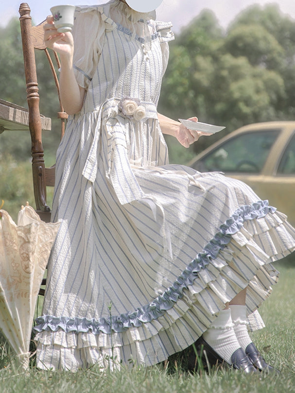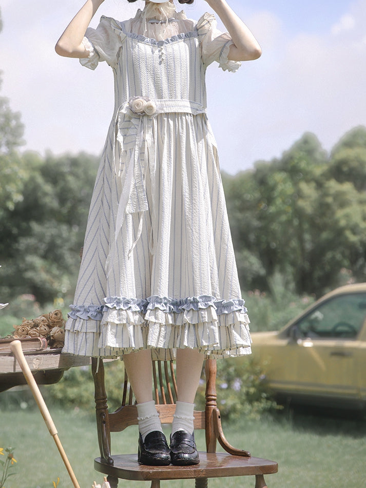 Blue and White Old School Lolita Fashion Dress Bowknot Detais JSK Set