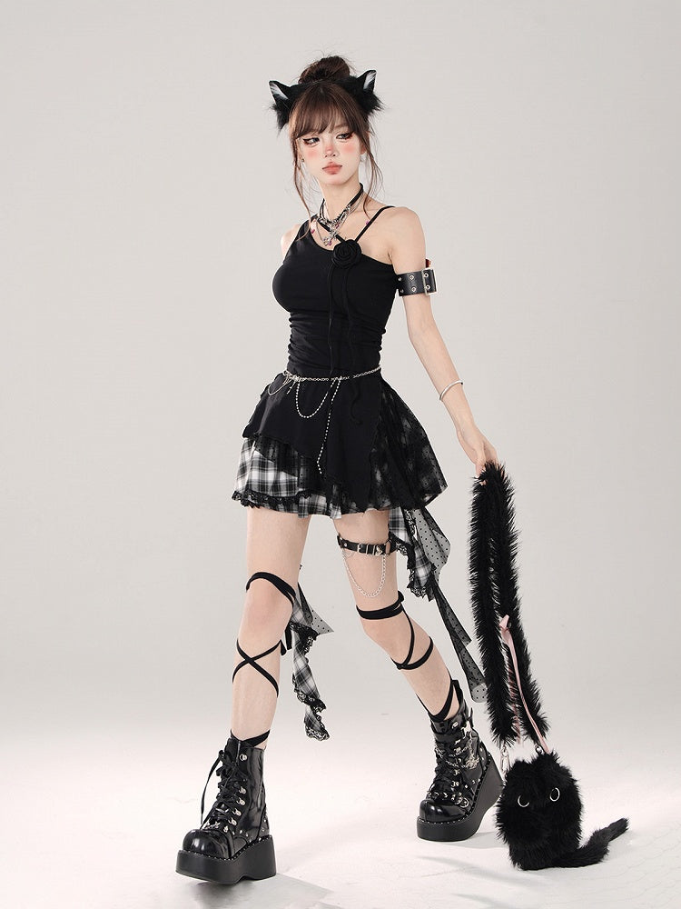 Black Sleeveless Top - Asymmetrical Shoulder & Rose Accent