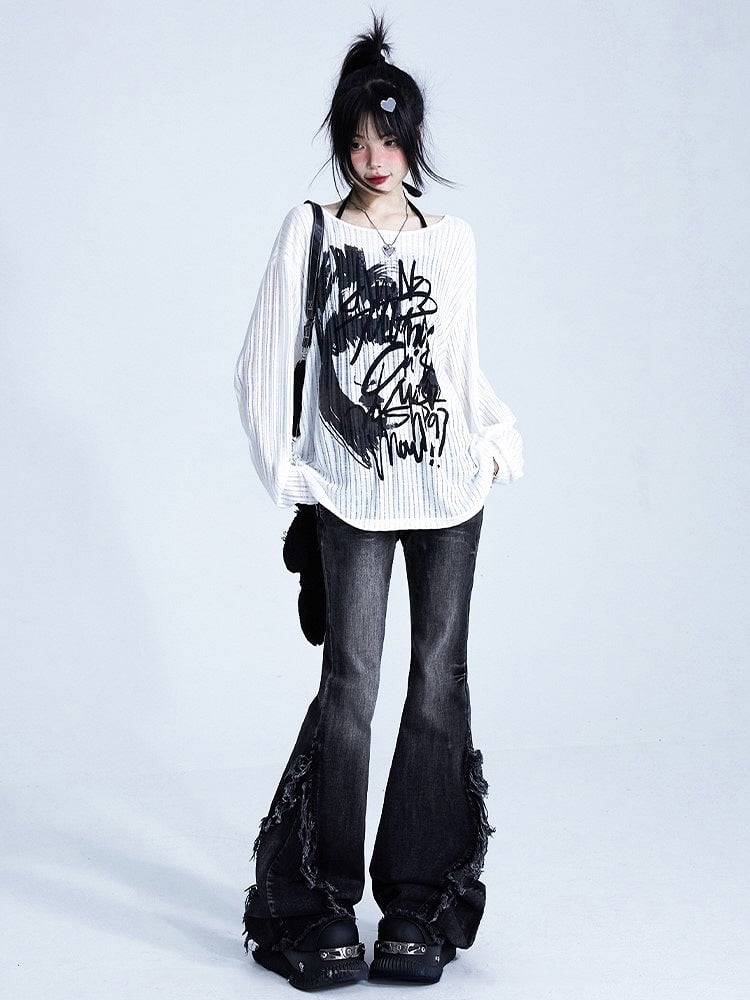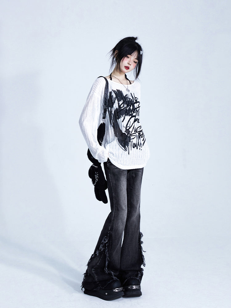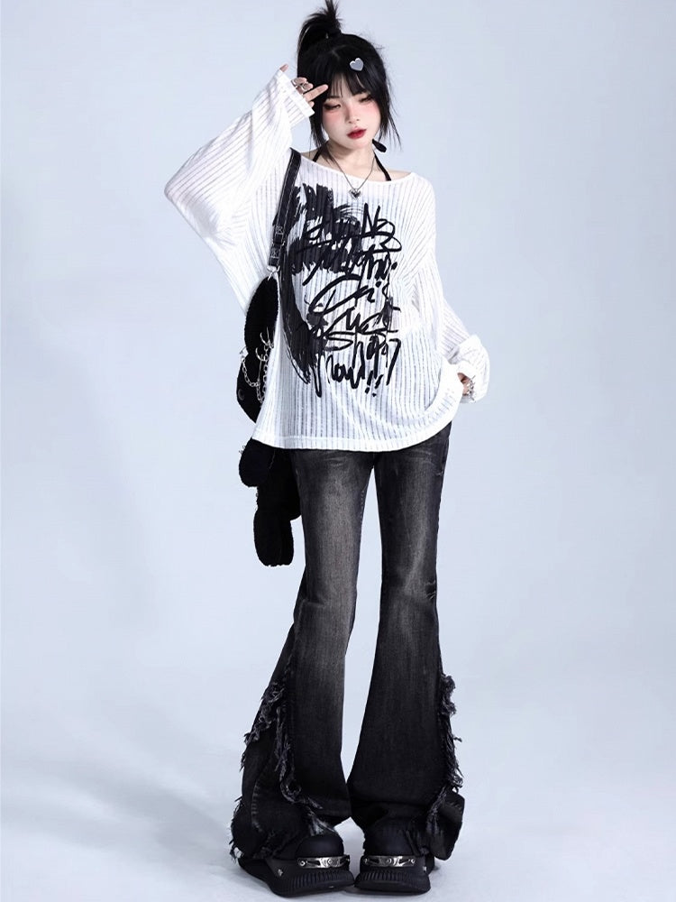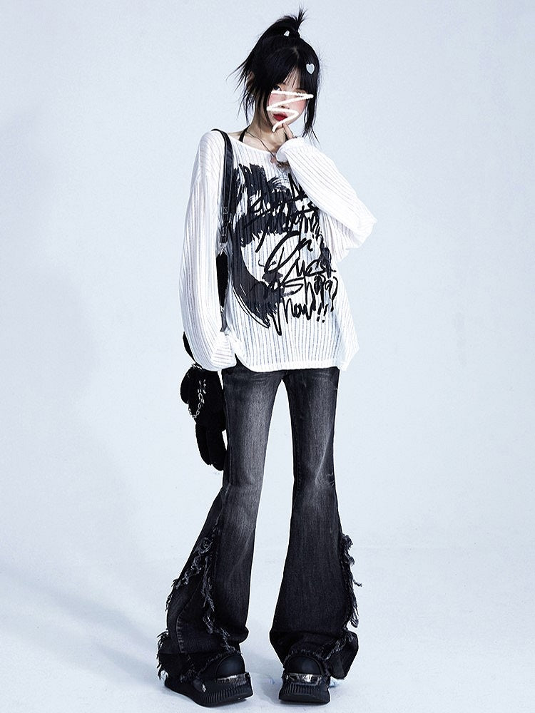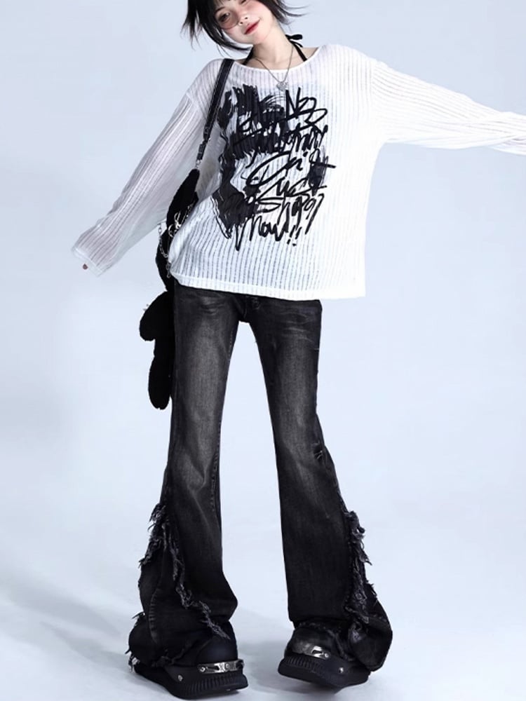 Seams Side with Wash Raw Hem Low-Waisted Black Flare Jeans Vintage