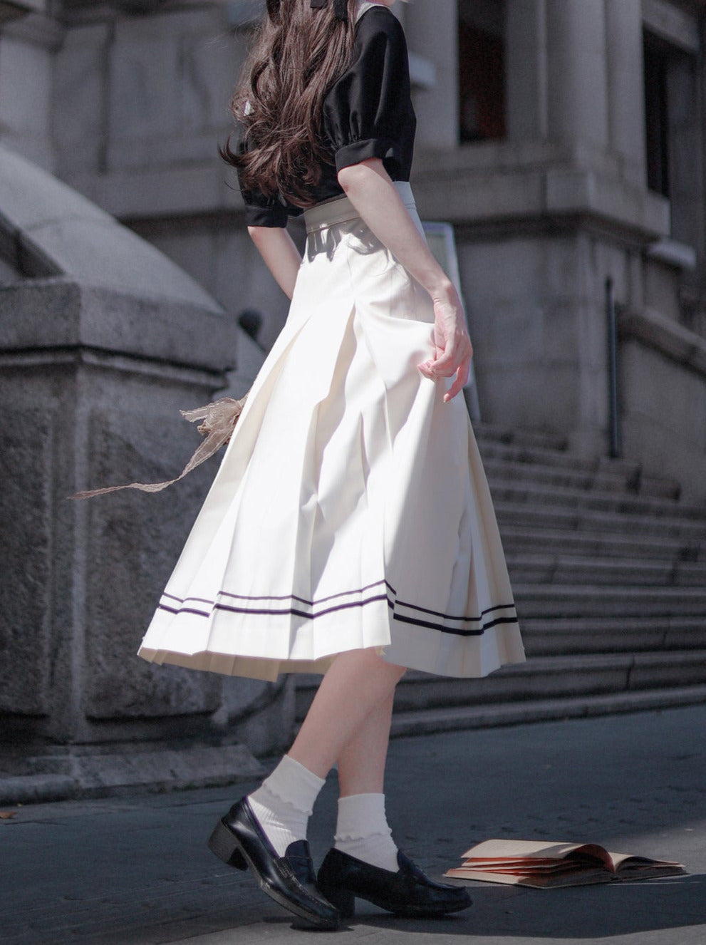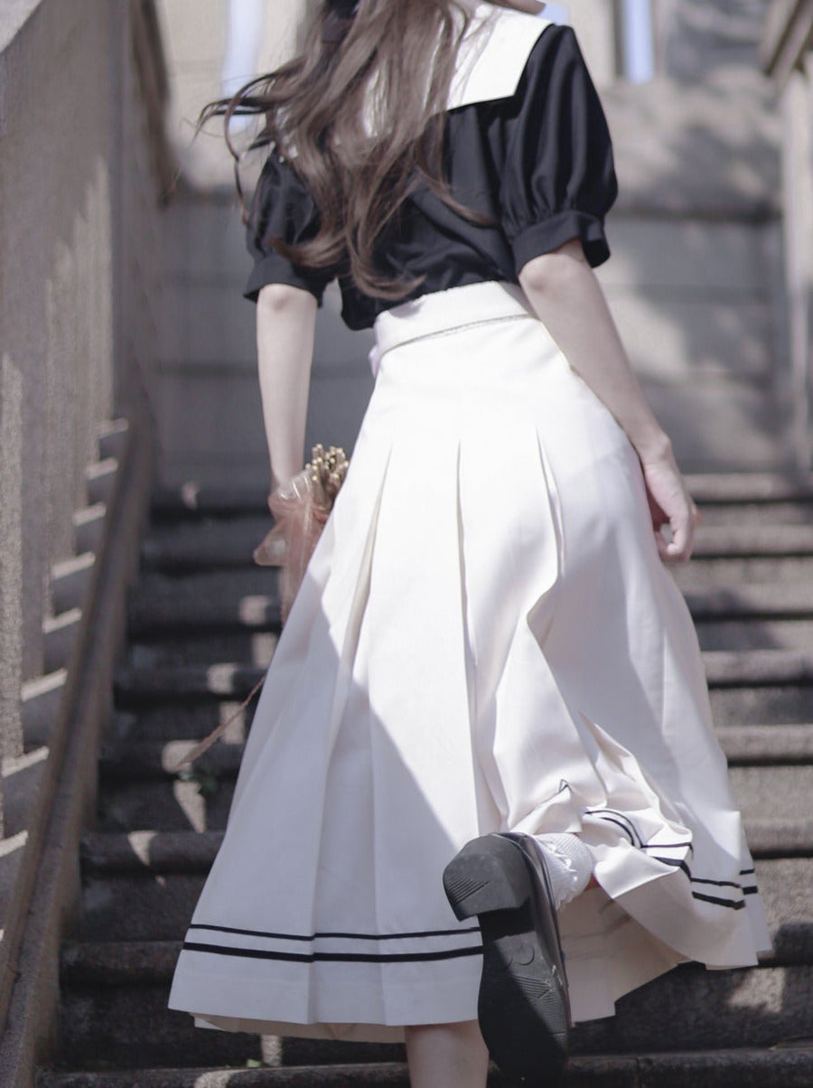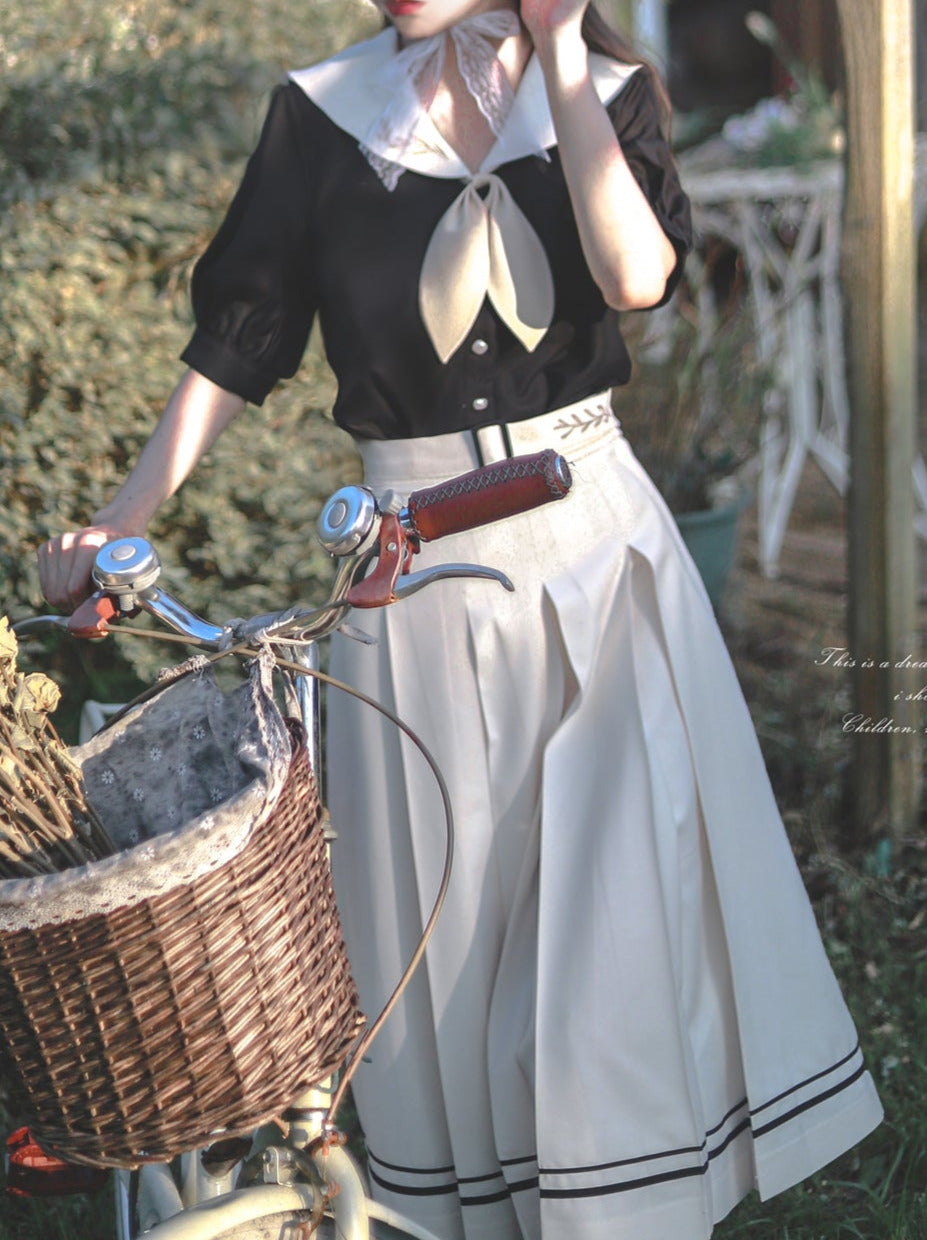 Shirt Elegant Box Sleeve + Ear French Sailor Bunny Retro Tie Puff Collar Pleated Skirt