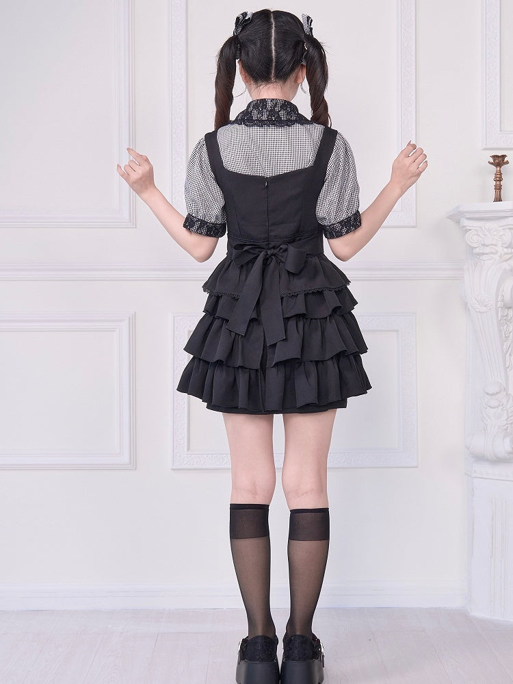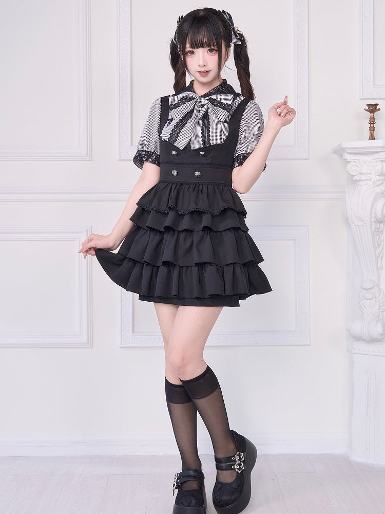 Short Sleeves Blouse with Bowknot Brooch Jirai Kei Plaid Black Lace Trim