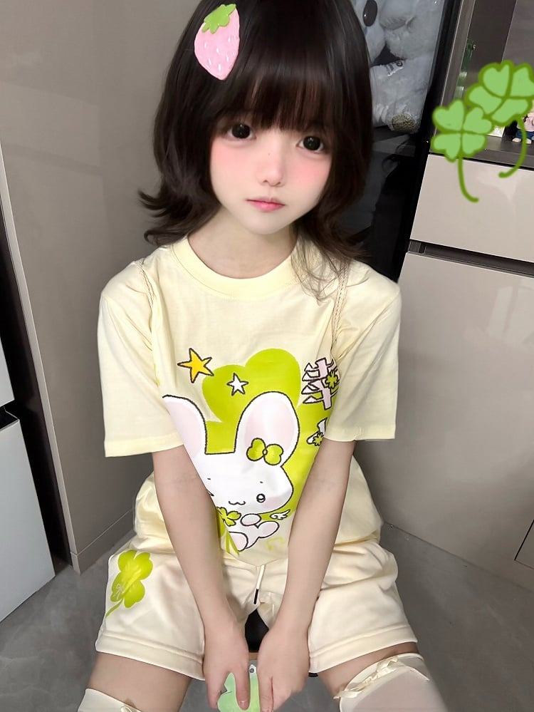 Shorts Lucky Four-Leaf Clover Print Beige Loose