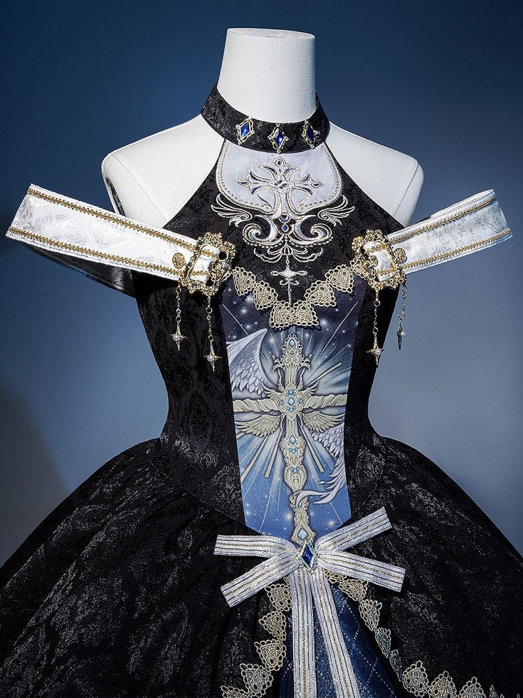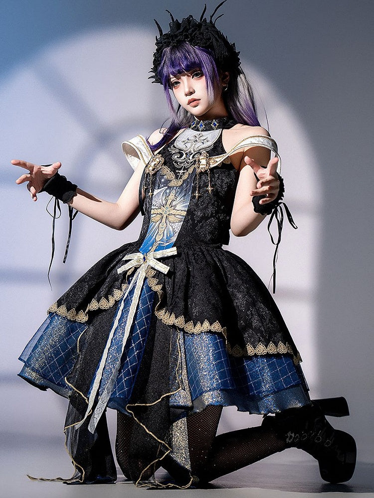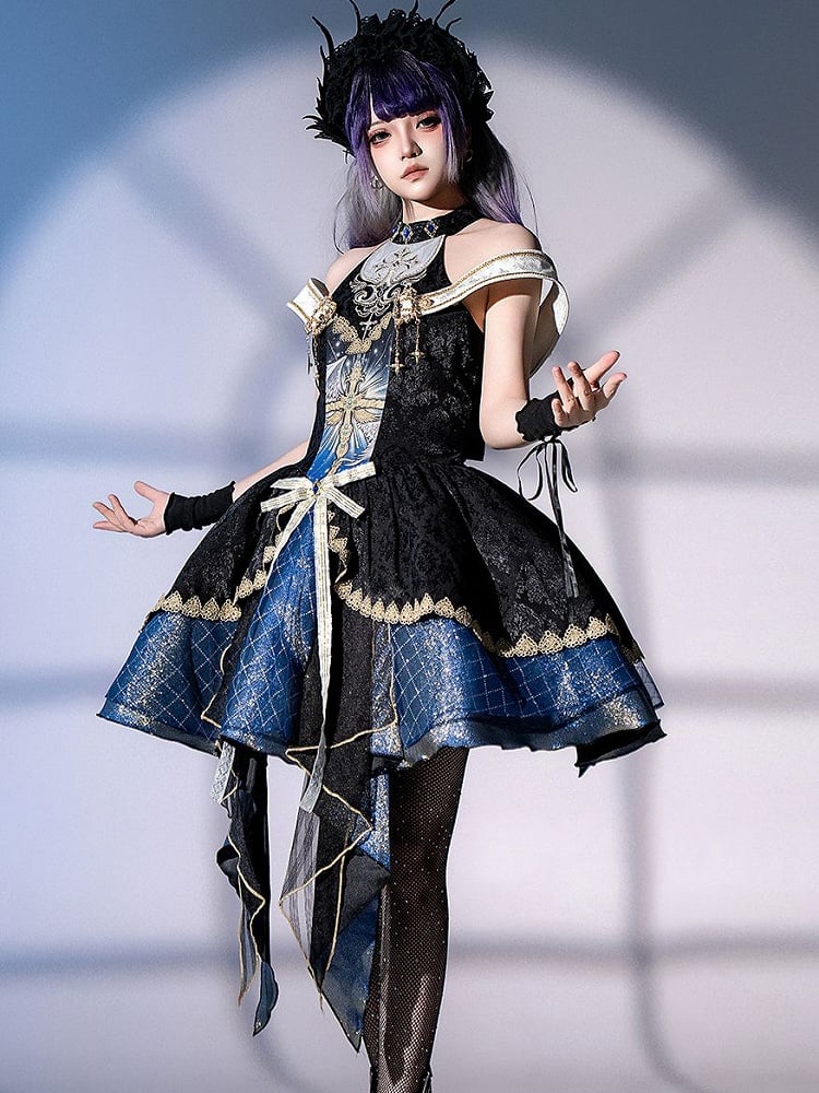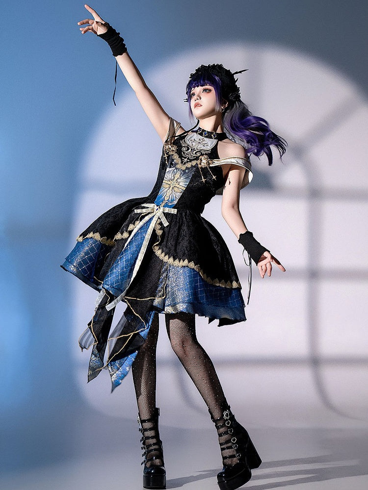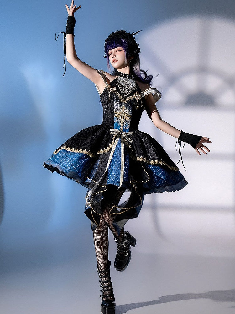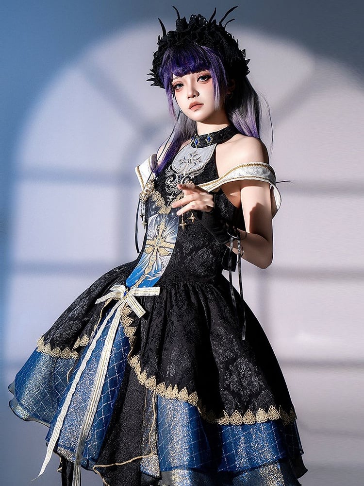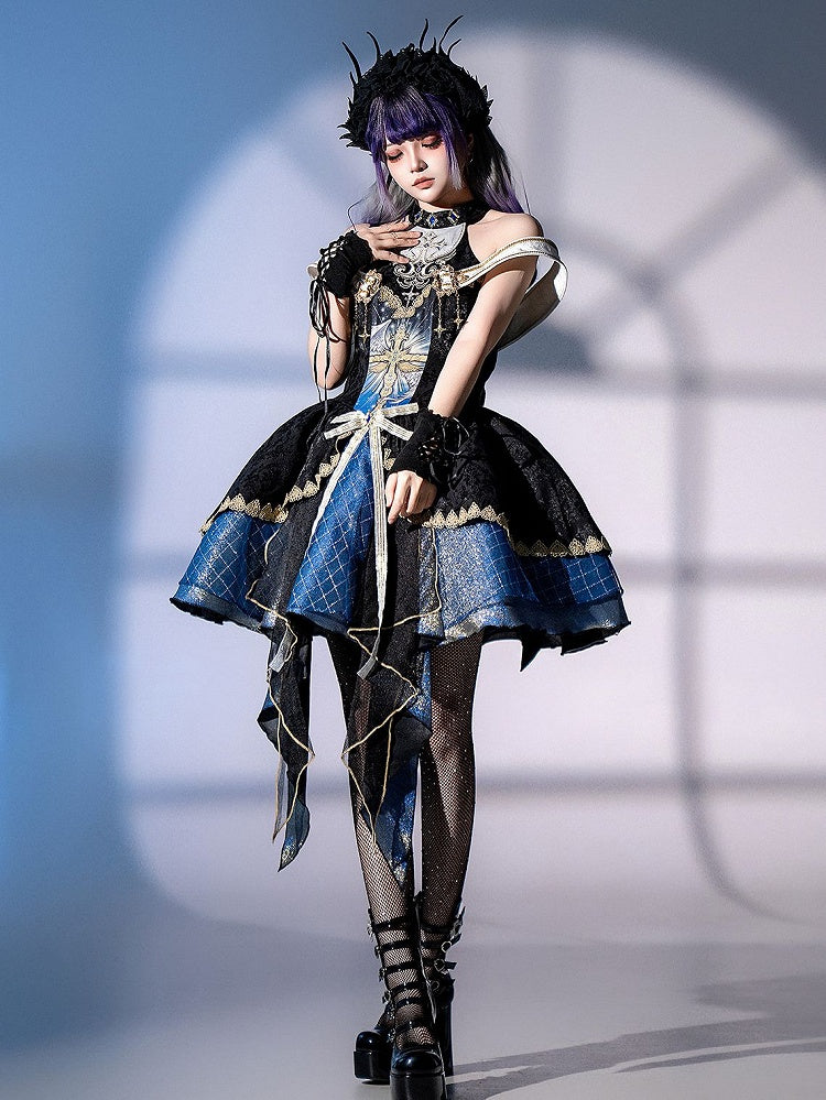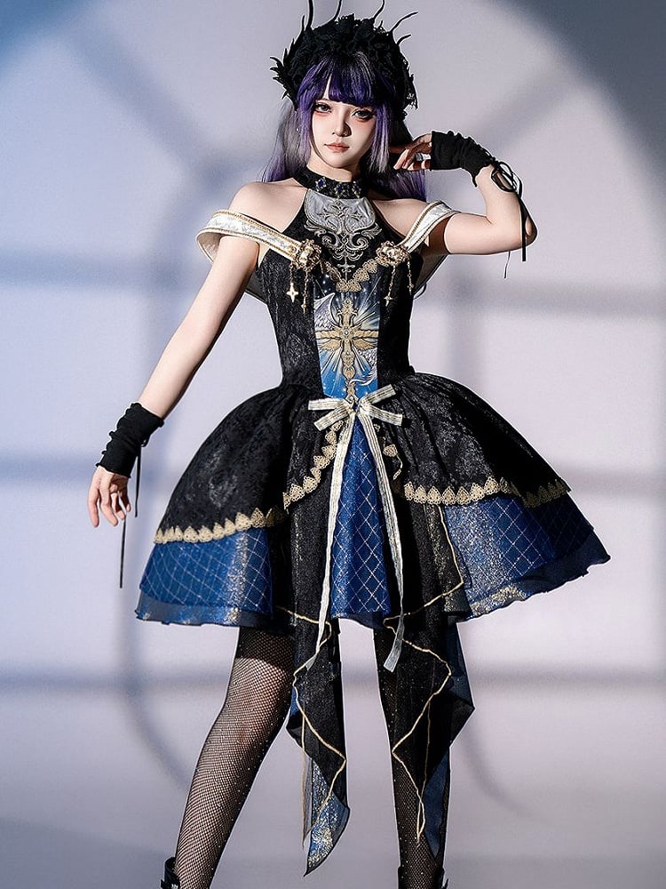 Skirt Cascading Front Design Ruffles Jumper Off-shoulder and Gothic Cross Neck Mock Print