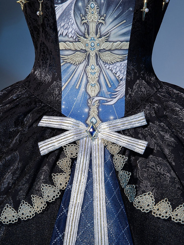 Blue and White Old School Lolita Fashion Dress Bowknot Detais JSK Set