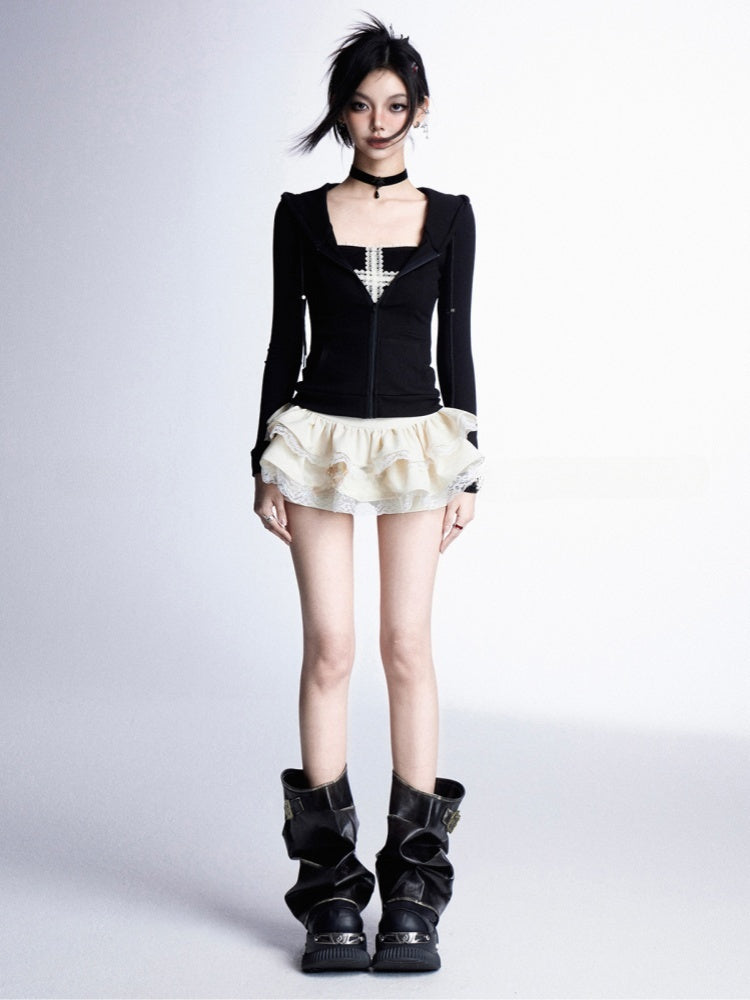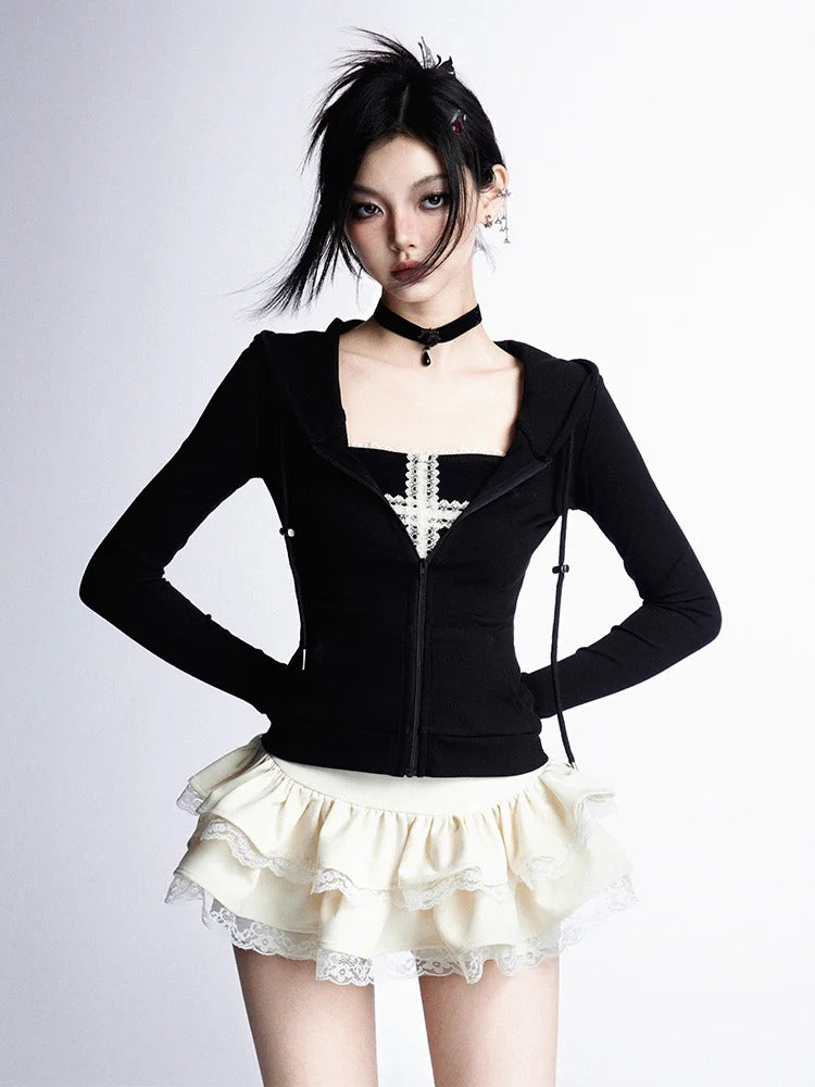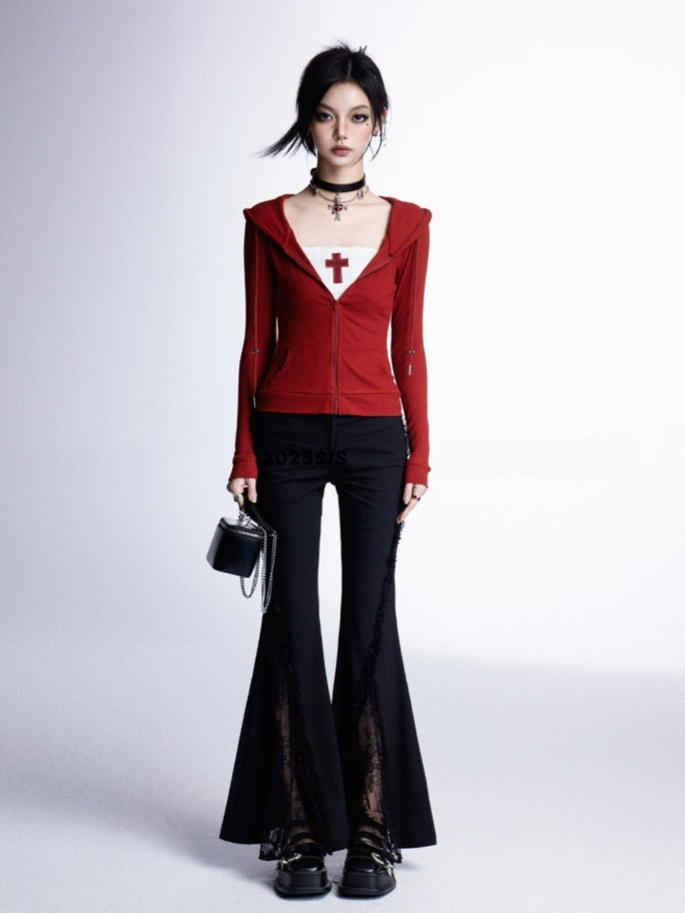 Black/Gray/Red Zip Closure Slim-fitting Hooded Top