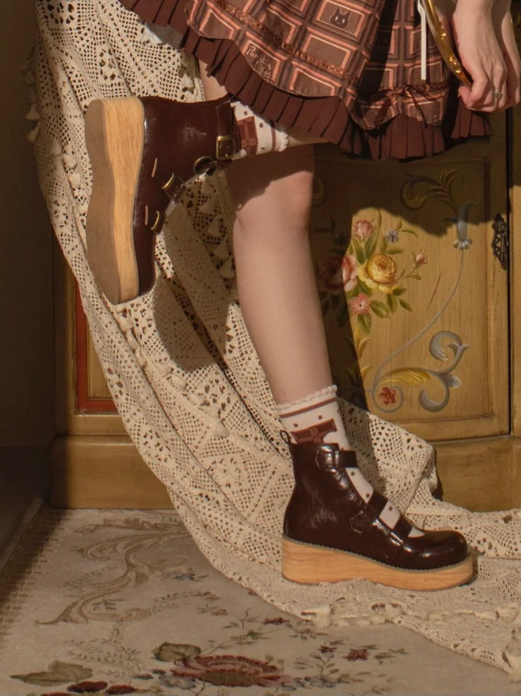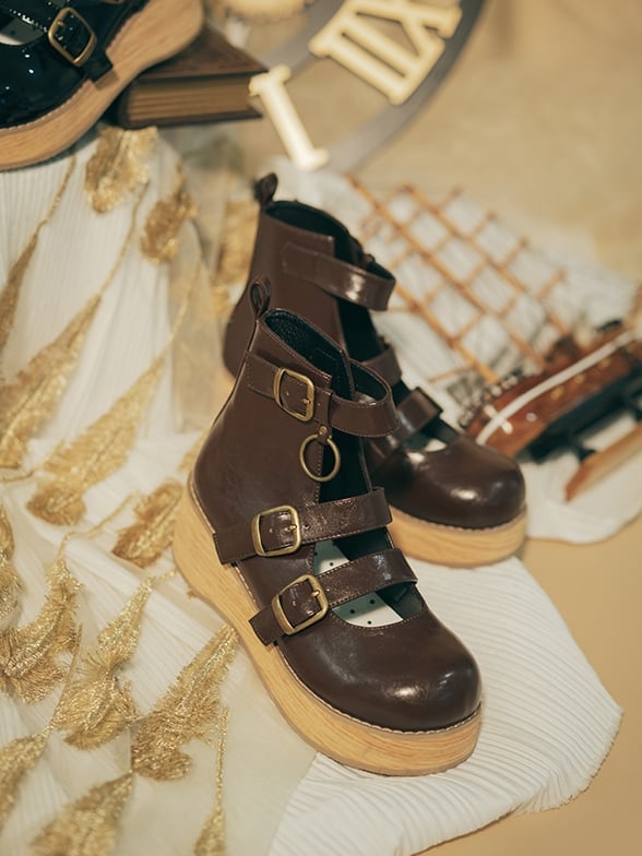 Vintage Brown 3–5 cm Wedge Sole Platform Ankle Boots - 3 Buckle Straps & Wood Grain Sole