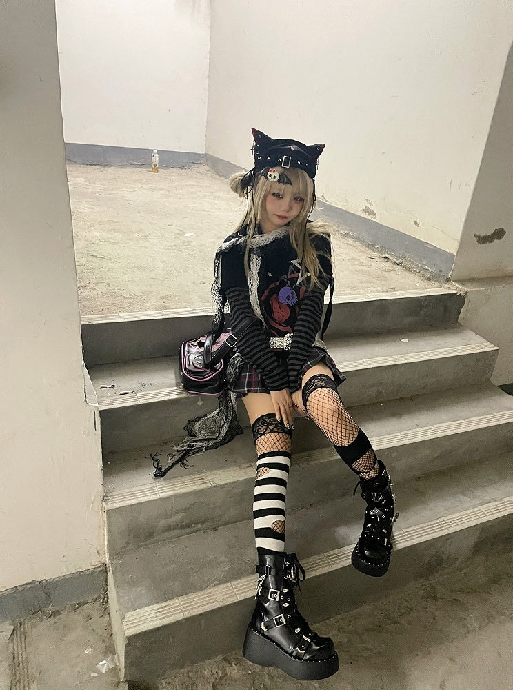 Star Print Punk Rock Black Skeleton Cotton Two-pieces and Top Faux